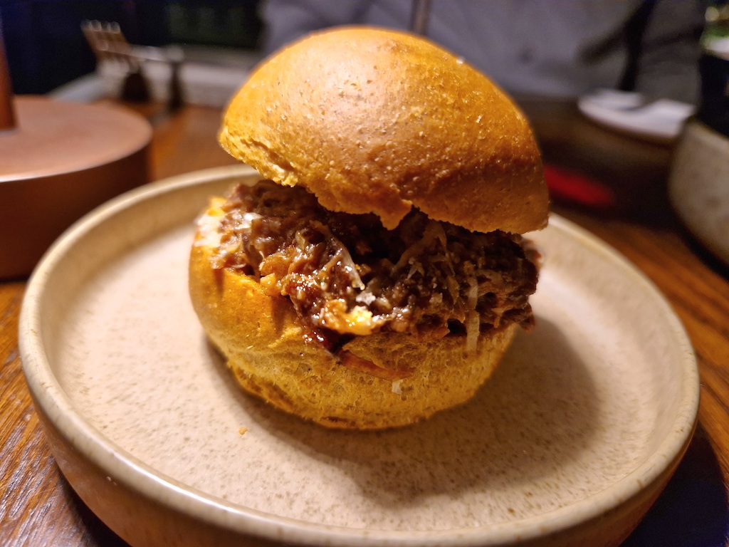 Lo ammettiamo, non è stato facile scegliere. I piatti sono golosi e diretti e qui la curiosità non manca. Alla fine, decidiamo e partiamo con Alici fritte accompagnate da maionese al wasabi. Frittura impeccabile, così come il wasabi dosato con la giusta intensità. A seguire, Bun di coda alla vaccinara, ovvero come riuscire a restituire il gusto del piatto più tradizionale di Roma, senza rinunciare alla modernità dell’involucro. Proseguiamo con Polpetta di ossobuco con salsa di midollo e zafferano, e subito dopo Tartare di Manzo, con carciofi, bottarga e gel d’uovo. Due piatti opposti, la coccola contro la tecnica, consigliatissimi entrambi. Specifichiamo che, la nostra, non è una sequenza gourmet, né una piramide del gusto, il consiglio è scegliere, mescolare un po’ le carte, divertirsi, giocare e assaggiare un po’ di tutto.