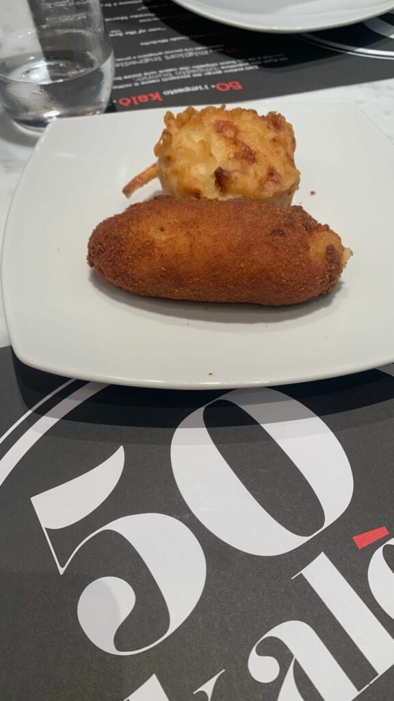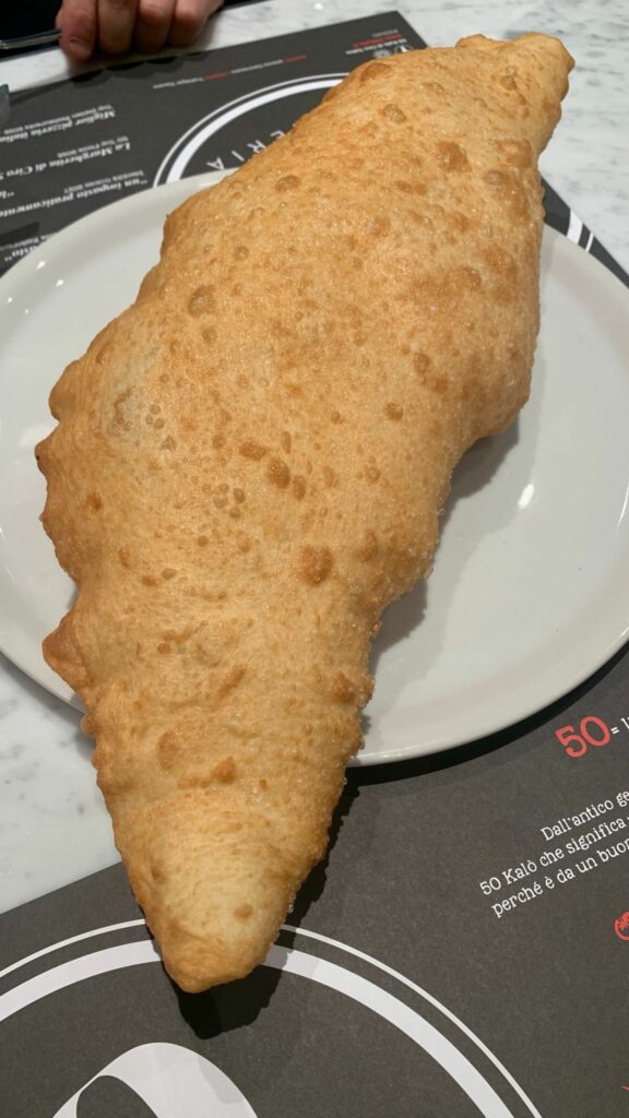 La pizza si presenta gigante e scenografica, ha un ripieno di ricotta di bufala, provola, cicoli di maiale artigianali e pepe nero Tellicherry, è fritta leggera, praticamente un’ossimoro, si fa mangiare con piacere senza far sentire quel senso di pesantezza e gonfiore che ci si aspetterebbe.