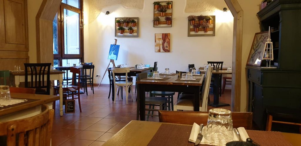 La sala è arredata con sedie, tavoli e complementi di riciclo acquistati in nei mercatini dell’usato e rimodernati dalla stessa Anna durante i lavori.