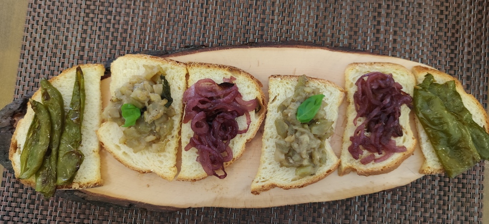 La tradizione fa da padrona. Squisiti i crostoni vegetariani con crema di melanzana, peperone cornetto e cipolla caramellata, chi vuole può optare in alternativa all’abbinamento con salumi e formaggi locali tra cui il capocollo di Martina Franca, il guanciale della Valle d’Itria, il filetto lardellato, la spianata dolce e piccante di Faeto o i formaggi freschi e semi stagionati di capra, pecora e misti.