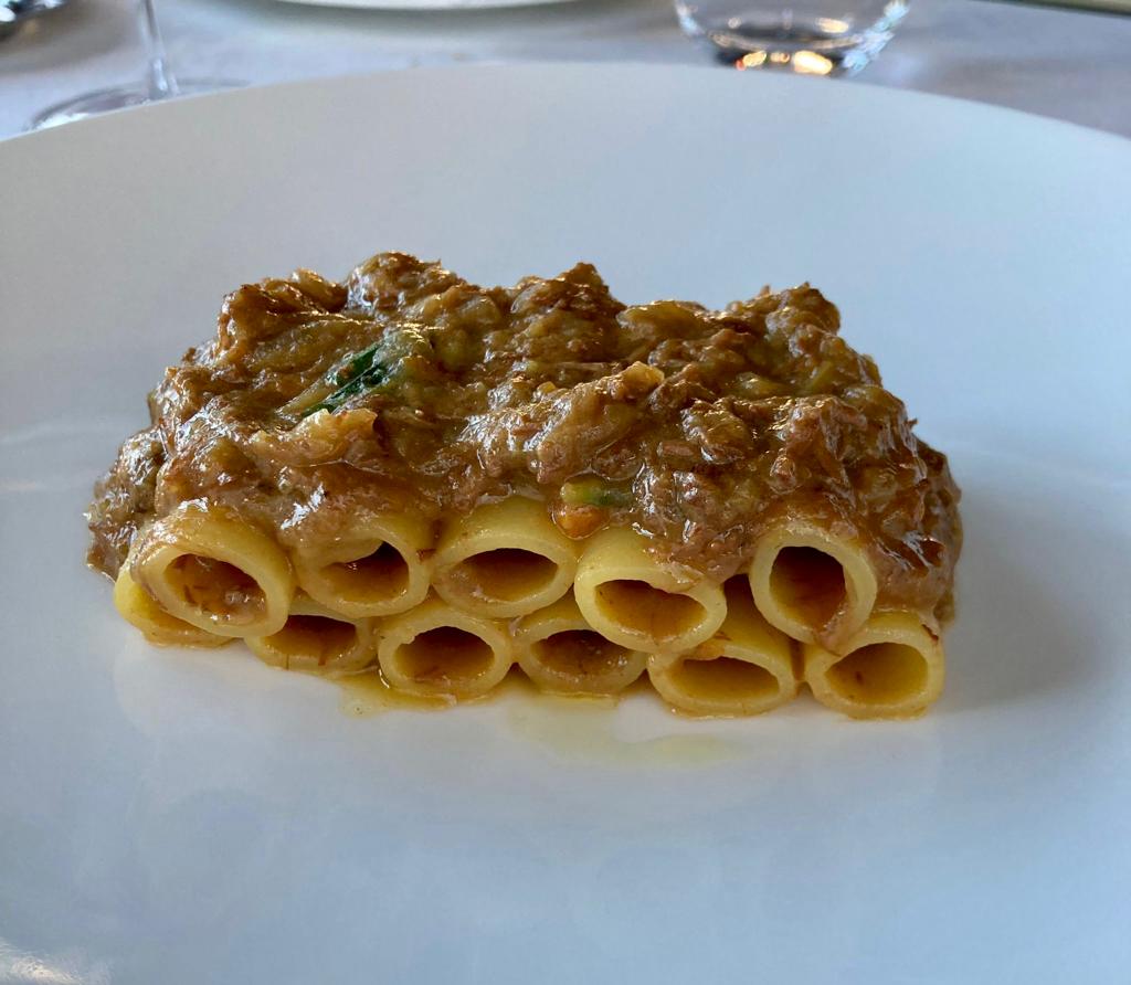 Vibrante e intensa come solo la Campania riesce ad essere, è la genovese, piatto retro-innovativo che istituzionalizza il valore del gusto. “La sfida è enorme perché parlare di piatti della memoria è accendere un ricordo, quello del profumo delle cipolle che cuociono lentissime assieme alla carne. Ho quindi cercato di reinterpretare me stesso all’interno del piatto, provando ad esprimere al massimo quell’odore”, spiega lo chef.
