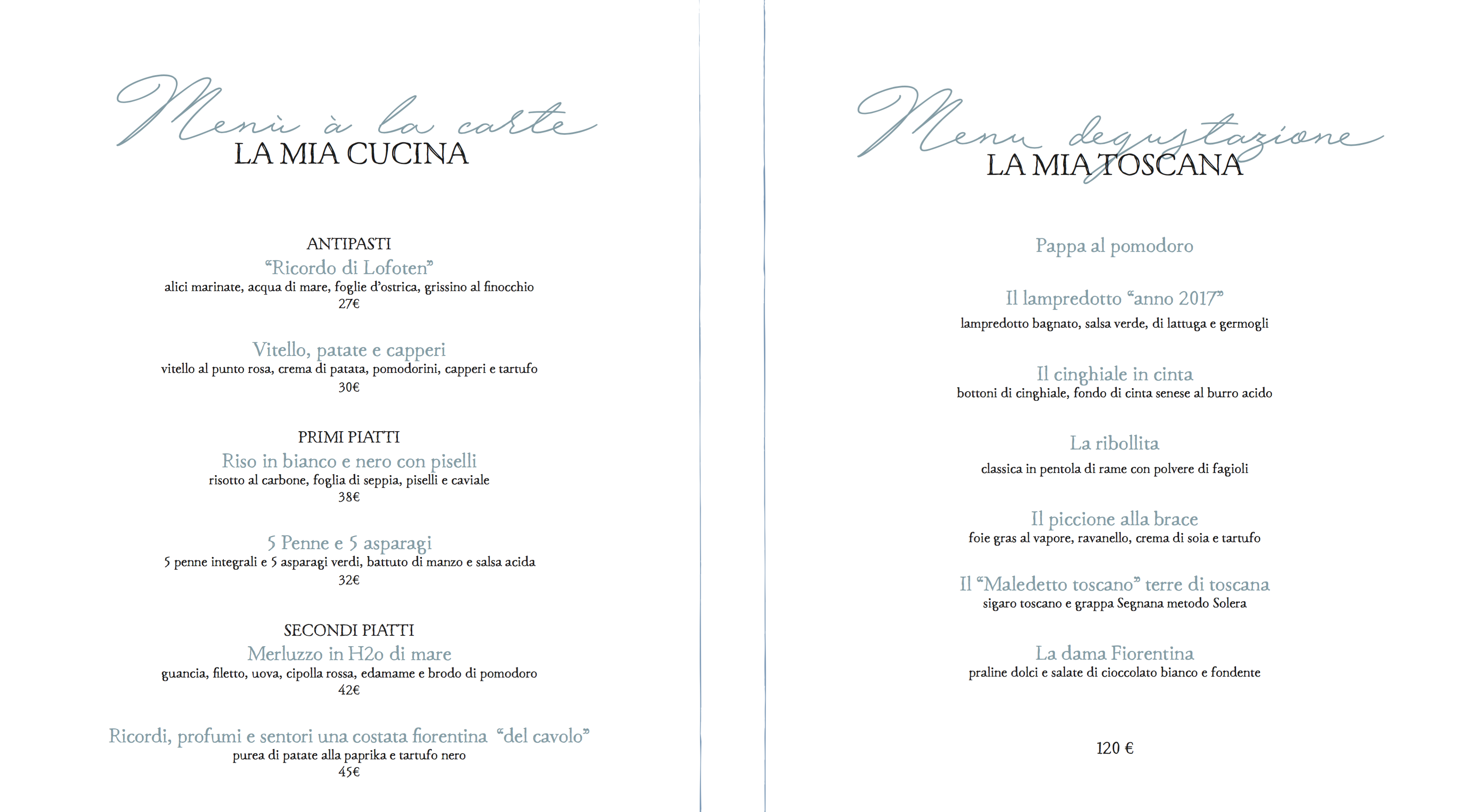 Rimangono anche i piatti à la carte, ma sono ridotti a 2 antipasti, 2 primi e 2 secondi. Tutti i piatti più classici che fino allo scorso anno erano in carta (ad esempio il minestrone o la tagliata) adesso passano in eredità al Picteau Lounge, il bar/lounge dell’Hotel Lungarno, prima aperto solo a pranzo, ma ora anche a cena, in grado di offrire una lista semplice e classica, per quelle sere in cui non si ha voglia di sperimentare, ma solo di comfort food di ottima qualità.