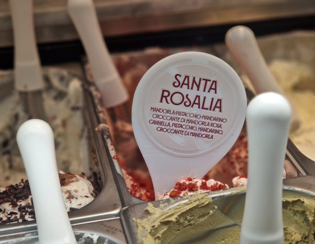 Accanto alla tradizione, in un’area a parte, dalla vetrina fanno capolino tanti gusti di gelato artigianale, dai più classici come nocciola, cioccolato, pistacchio si passa a quelli esotici come il mango ma anche un gusto che da solo racconta il capoluogo siciliano, omaggio alla Santuzza, amata patrona di Palermo: Santa Rosalia con mandorla, pistacchio, mandarino, croccante di mandorla, rosa e cannella, in un solo gusto tutto il meglio della Sicilia. Provare per credere!