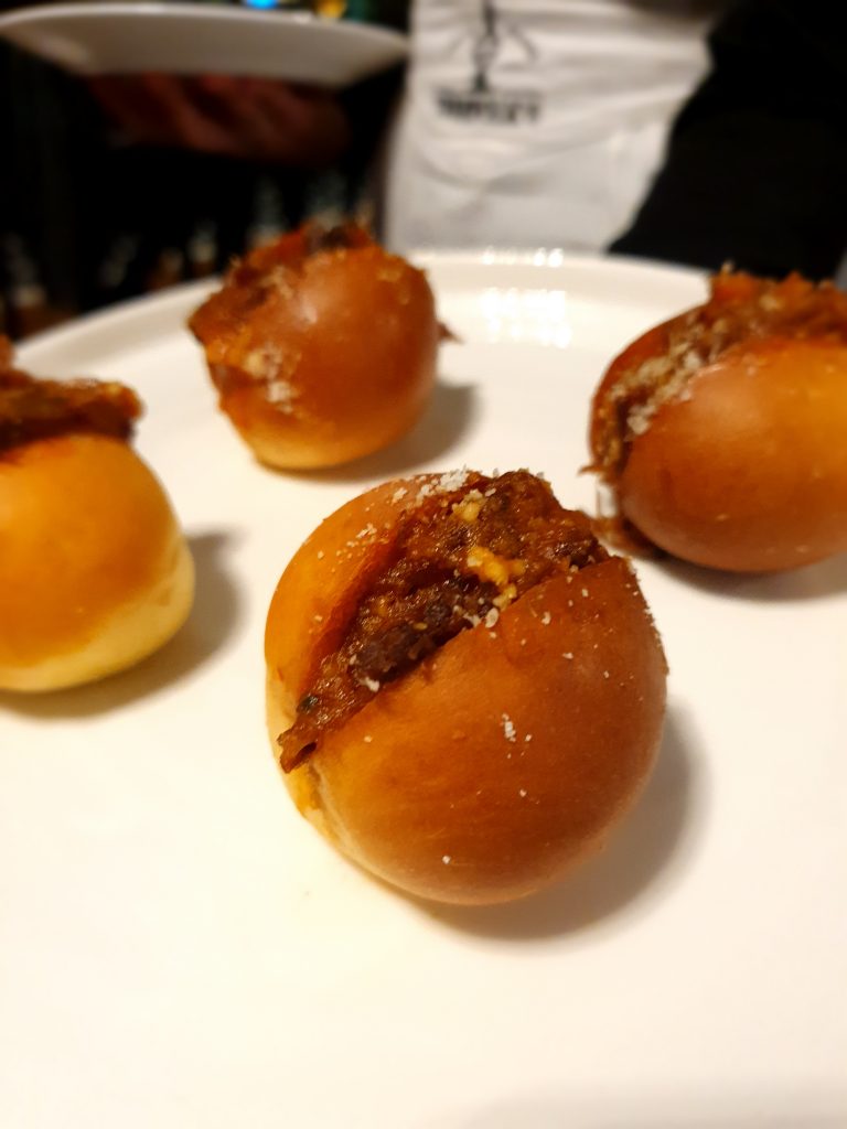 All’ora dell’aperitivo, via libera a drink alcolici e birre, accompagnati dagli sfizi proposti dallo chef come le tipiche Pie salate, ripiene però di prodotti italianissimi come pollo alla cacciatora, manzo alla picchiapò e baccalà mantecato.