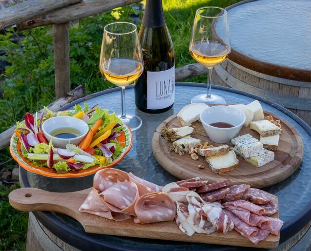 Cuore del progetto è la nuova cantina, dedicata alla valorizzazione dell’Albugnano DOC, espressione di Nebbiolo in purezza ancora poco conosciuta ma fortemente identitaria. Cà Mariuccia partecipa attivamente a questo percorso sin dal 2017 attraverso il progetto Albugnano 549, contribuendo alla promozione di una denominazione che interpreta il vitigno in chiave collinare e alternativa rispetto ai distretti più noti. La cantina nasce come spazio di degustazione e confronto, con un tavolo conviviale da 22 posti dedicato a degustazioni guidate e serate tematiche. Qui i vini della casa dialogano con etichette selezionate, ampliando la lettura delle diverse espressioni del Nebbiolo. Accanto al vino, formaggi e salumi provenienti da una rete di produttori contadini selezionati completano l’esperienza, integrandosi nel percorso degustativo e nella vendita diretta.