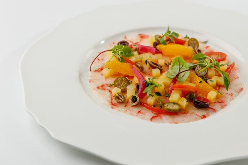 In questo percorso consacrato al mare, ci concediamo una piccola incursione sulla terra, e gustiamo la deliziosa Tartare di carne cruda piemontese foie gras affumicato e polvere di capperi. La carne di fassona battuta al coltello e condita a dovere, si sposa perfettamente con la dolcezza del fois gras, lievemente affumicato, mentre la polvere di capperi conferisce croccantezza e riequilibra il palato col giusto apporto salino. Nel piatto una lacrima di aceto balsamico tradizionale di Modena, completa il tutto.
