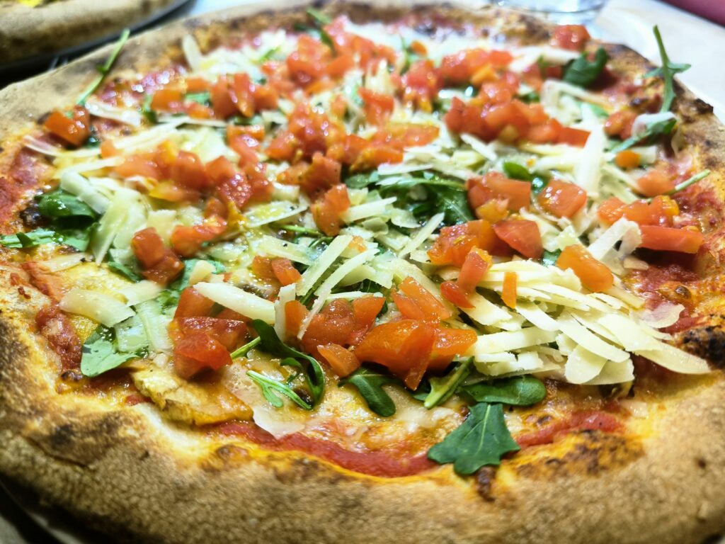 Un capitolo a parte merita la pizzeria. L’impasto delle pizze ha una maturazione a temperatura controllata di almeno 48 ore ed è realizzato con  farine biologiche di grani antichi siciliani come MaiorcaRussello e Senatore Cappelli/Bidì. La lievitazione naturale avviene grazie ad un lievito madre attivato nel 1920, introdotto all’Antico Baglio dallo chef Natale Allegra nel 2009. La lunga lievitazione unita all’uso di prodotti delle Madonie come i funghi cardoncelli, i formaggi, l’olio extravergine d’oliva, l’acqua di sorgente, sono il valore aggiunto che fa la differenza. L’uso del forno a legna rotativo assicura una cottura uniforme della pizza. In questo locale si serve la pizza senza glutine.