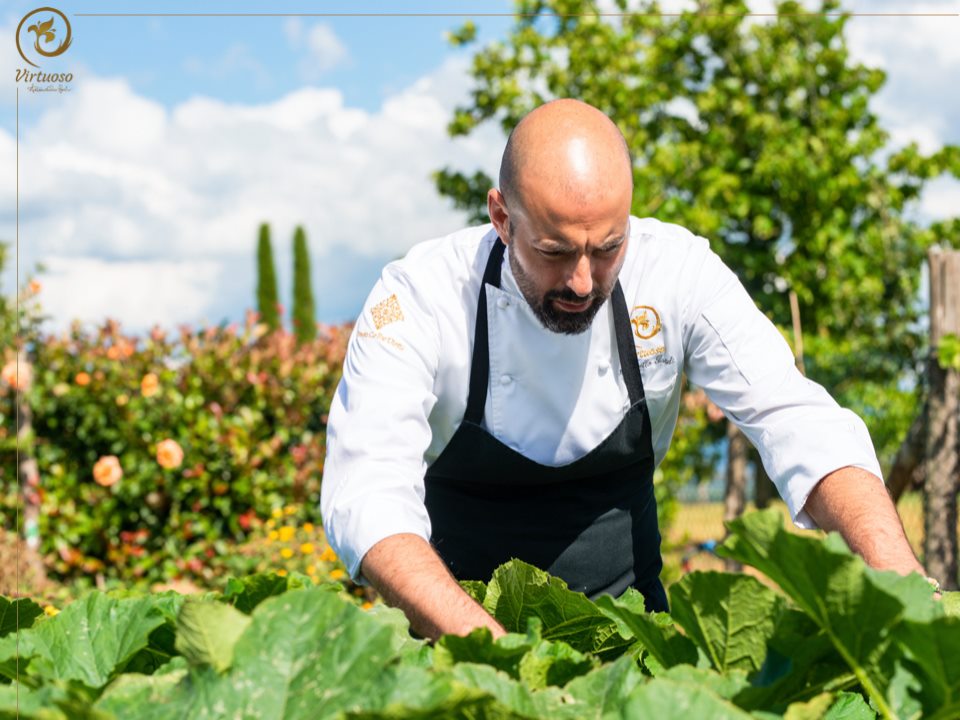 Antonello Sardi è una delle stelle verdi della guida Michelin, novità dell’anno per tutti quei ristoranti che abbinano alla cucina gourmet la tematica green. Il ristorante Virtuoso Gourmet della Tenuta Le Tre Virtù è un progetto nato nel 2014, con la filosofia della sostenibilità come concetto cardine. La Tenuta comprende, oltre al ristorante Virtuoso Gourmet, un’azienda agricola bio-certificata con animali da cortile e coltivazione di piante di frutti antichi, ulivi e una vigna, allo scopo di incentivare l’autoproduzione delle materie prime.