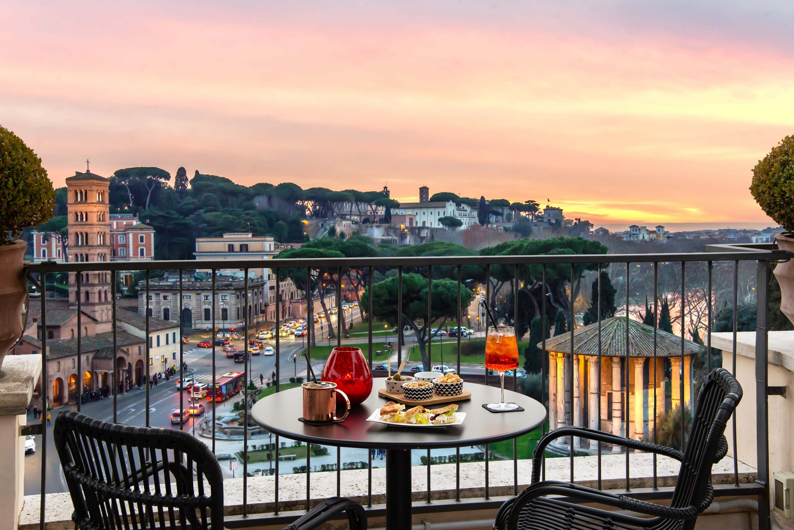 Le camere del quinto piano sono tutte con terrazza in legno ipè, arredata con salottini e piante della Macchia mediterranea, dal rosmarino all’ulivo, per rilassarsi in un inebriante salone a cielo aperto con una impareggiabile vista sui templi della Roma antica, sulla Basilica di Santa Maria in Cosmedin e sul Campidoglio. Al quarto piano, si trovano le camere dedicate ai grandi maestri della fotografia, come Helmut Newton, Elliott Erwitt e Luca Campigotto.