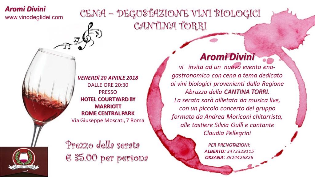 Aromi Divini, venerdì 20 aprile, presso l’Hotel Courtyard by Marriot Rome Central Park, porterà in scena una cena a tema dedicata ai vini biologici provenienti dalla regione Abruzzo della Cantina Torri. Ad accompagnare i piatti della serata, tanta musica dal vivo.
