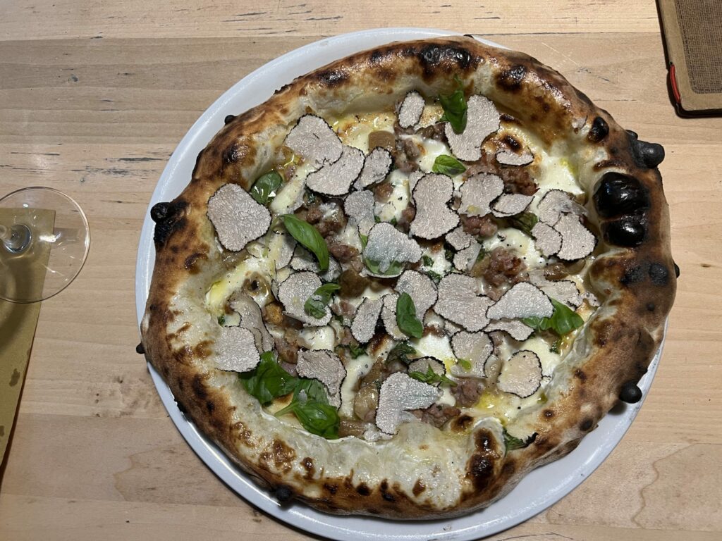 Azimut è la pizza più richiesta nel locale: fior di latte di Agerola, patate cusanesi al forno, pancetta e provola. Appagante alla vista, è un concentrato di sapore. La Norcina, con fiordilatte di Agerola salsiccia fresca, funghi e tartufo, è una pizza sicuramente efficace e tanto golosa. Proposta intrigane è invece la Baccalà, con fiordilatte di Agerola e scarola. La pizza fuori carta, asparagi, pancetta e fiordilatte, è appetitosa con sostanza che sprizza da tutti i pori.