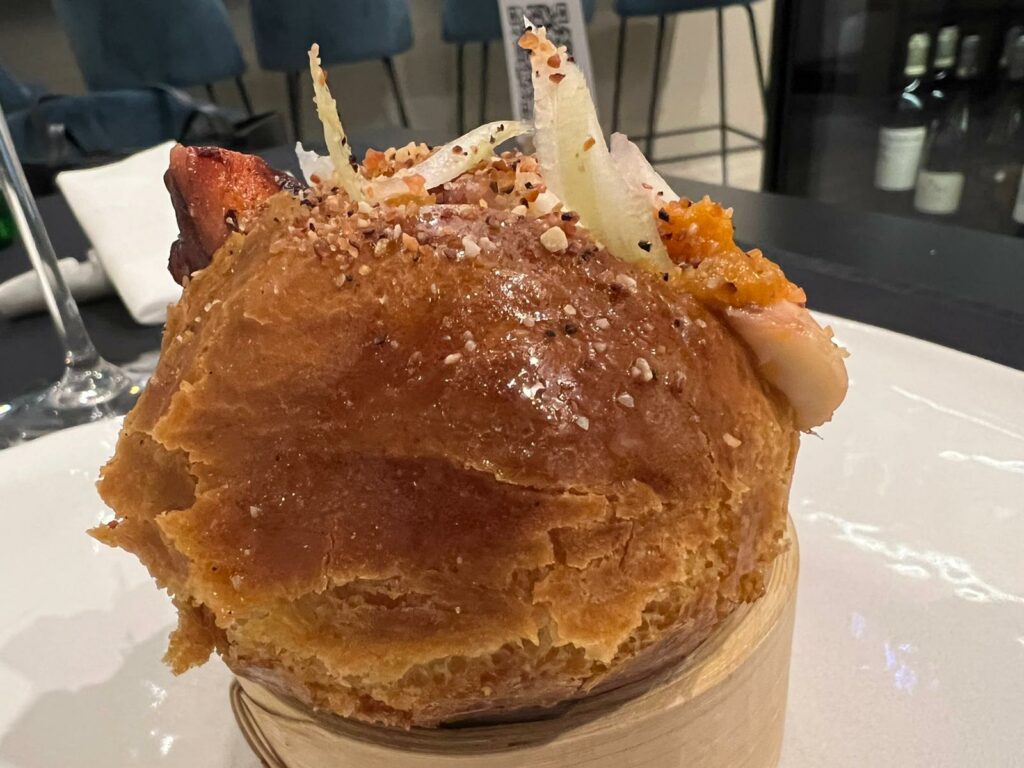 Così, in una cornice minimal-chic, con circa 30 posti a sedere e una fila di 1000 origami a forma di gru che scendono dal soffitto, simbolo di libertà e realizzati dall’artista casertana Rossella Giuliani, escono scenografici piatti come Sapporo (dal nome di una zona del Giappone molto fredda), in cui l’ostrica concava di Bretagna viene affiancata da granita di kombucha, kiwi, lime e acetosella.