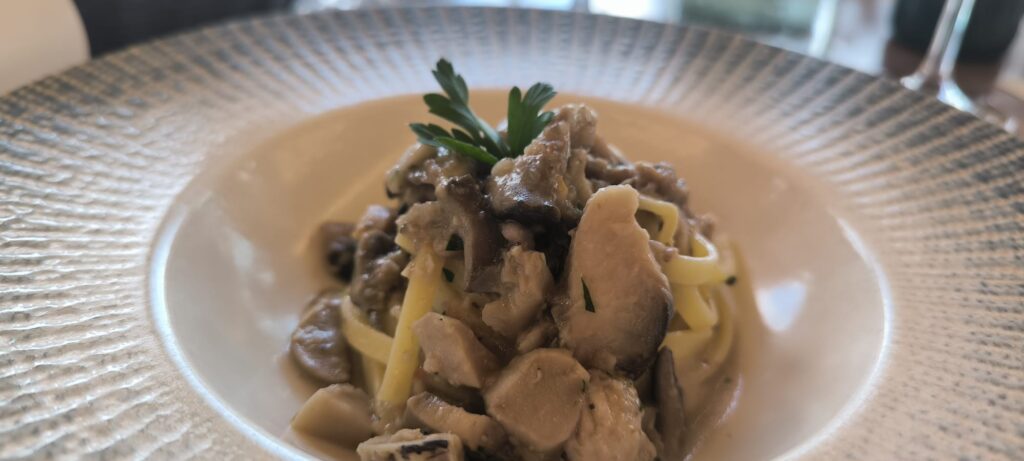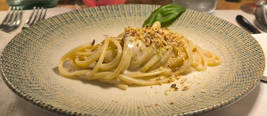 Se poi siete alla ricerca di un piatto che, oltre ad essere straordinariamente buono nella sua assoluta semplicità, è anche molto scenografico, dovete assolutamente provare le linguine, cacio, pepe e scorza di limone bio di Bergi con mandorle pizzute mantecate proprio davanti ai vostri occhi in una forma di cacio locale: una vera delizia per gli occhi oltre che per il palato, di cui non stenterete a chiedere il “tris”.