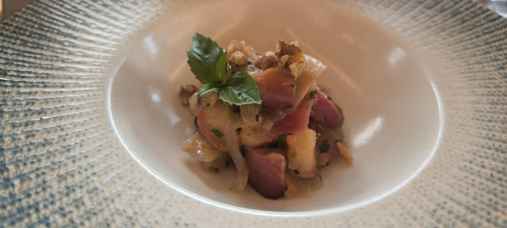 Il nuovo menu d’autunno di Bergi è una festa di colori, profumi e sapori offerti dal generoso parco delle Madonie trasformati in cibo del conforto dalle sapienti mani di chef Di Garbo. Si comincia dagli antipasti come la caponata di mele in bianco addolcita dal miele autoprodotto, i fiori di zucca e cardi fritti in pastella, le olive “cunzate“ con mollica di pane, formaggio, aglio, olio e peperoncino (solo per citarne alcuni).