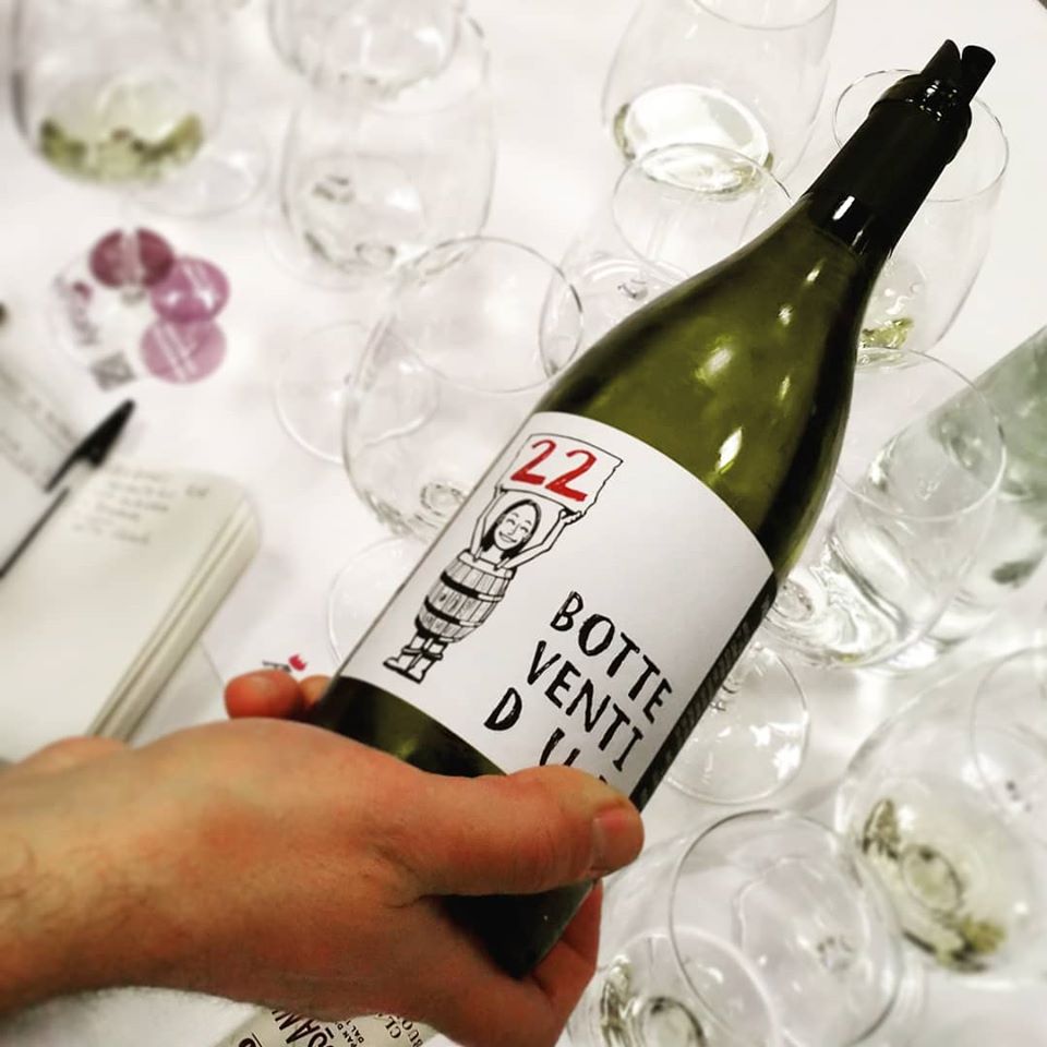 Nello splendido borgo medievale arroccato di Olevano Romano, a sud-est di Roma, Damiano Ciolli, un ragazzone simpatico e di talento, realizza con la complicità di un territorio collinare e montagnoso di origine vulcanica grandi rossi da uve Cesanese d’Affile. Un giorno in cantina arriva una botte nuova per il Cirsium (una delle due etichette di Cesanese prodotte) e Letizia (sua compagna nonché enologa) che fa? Si inventa, per “sgrassare la botte”, un esperimento di vino bianco, il primo per l’azienda. L’esperimento è così convincente che Damiano e Letizia decidono di farci un’etichetta ad hoc e commercializzarlo. Così nasce il Botte 22, un bianco ottenuto da un blend di Trebbiano verde (70%) e Ottonese (30%) da vecchie vigne impiantate su terre rosse vulcaniche ad una altitudine di circa 350m sul livello del mare. La vendemmia è manuale, generalmente verso fine settembre. Dopo lo scarto del raspo, macerazione a contatto con le bucce per una notte a bassa temperatura, segue svinatura e premitura per effettuare la fermentazione in botti di rovere austriaco. Fermentazione alcolica spontanea in botte di rovere senza il controllo della temperatura. Maturazione per circa 11 mesi in botte a contatto con i propri depositi, travaso dopo 11 mesi in vasche di cemento dove rimane per circa un mese prima di essere imbottigliato. Nel calice si presenta di un giallo paglierino intenso con riflessi dorati. Fragranti sentori di frutta gialla matura e di fiori bianchi anticipano note di burro e mallo di noce, su uno sfondo leggermente affumicato. Sorso pieno e fresco, con le morbidezze del burro e della frutta matura sono bilanciate da una grande sapidità che tradisce la matrice vulcanica dei suoli e regala un finale lungo di mandorle salate e noci.