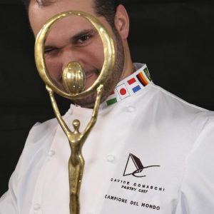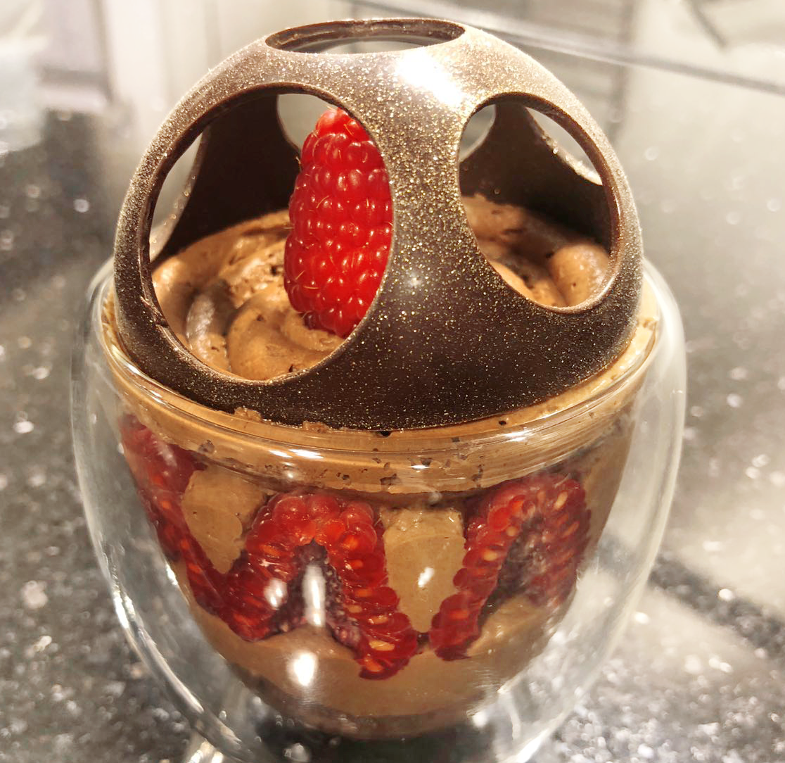 “Ho deciso di decorare la mousse con una cupola forata di cioccolato fondente, in modo che ricordi uno scrigno che custodisce un tesoro – racconta Comaschi -. Nel mio caso ho utilizzato un lampone ma, trattandosi del Bicchiere degli innamorati, si potrebbe sostituire con un anello di diamanti per una dichiarazione di grande effetto”.