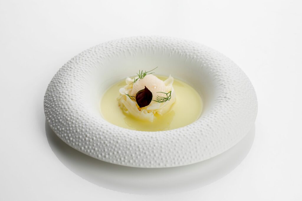L’ultimo menù è decisamente molto più nelle corde del nuovo chef, che nella sua filosofia vuole coniugare i sapori e la sua tradizione campana con quella emiliana. Ed ecco che l’antipasto è una tagliatella di seppia adagiata in un guazzetto di finocchio e aria di pompelmo rosa e i passatelli vengono serviti asciutti con baccalà, uvetta e salsa di pinoli.