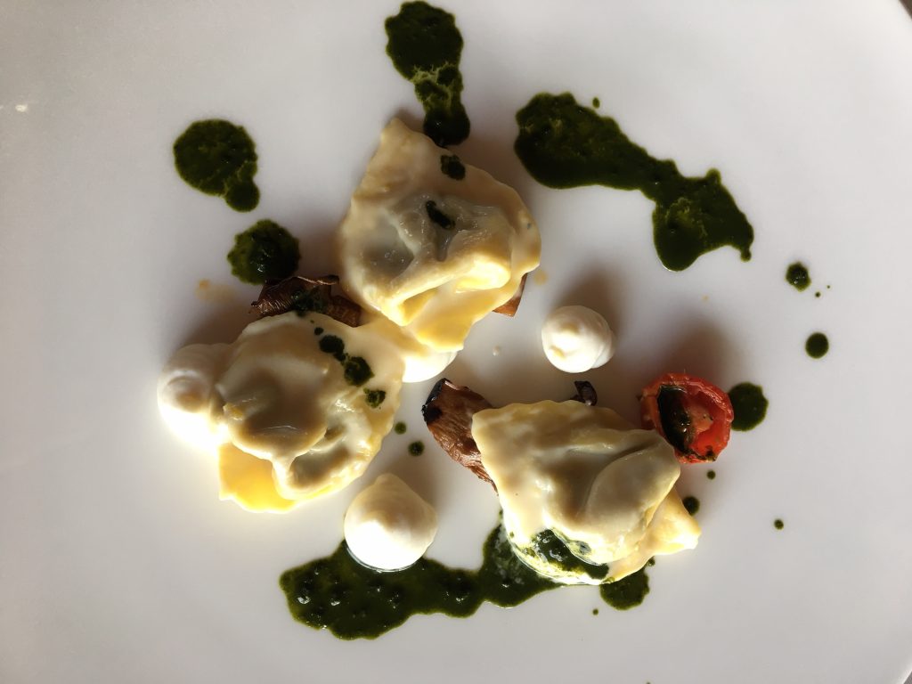 Il menù, oltre ai piatti iconici che in questi anni hanno contraddistinto la proposta legata alla tradizione come Tortellini goccia d’oro in doppio brodo di cappone “come si faceva in Piazza della Mercanzia” (e vincitori del Tortellino d’oro nel 2018) e alle Tagliatelle al Ragù Bolognese, propone alcune rivisitazioni come il Tortello al brasato di manzo funghi marinati, ricotta profumata al limone e gocce di cavolo nero. Non mancano le novità come i Maccheroncini al torchio con canocchie, stufato di porri e mele verdi, gocce di tartufo nero.