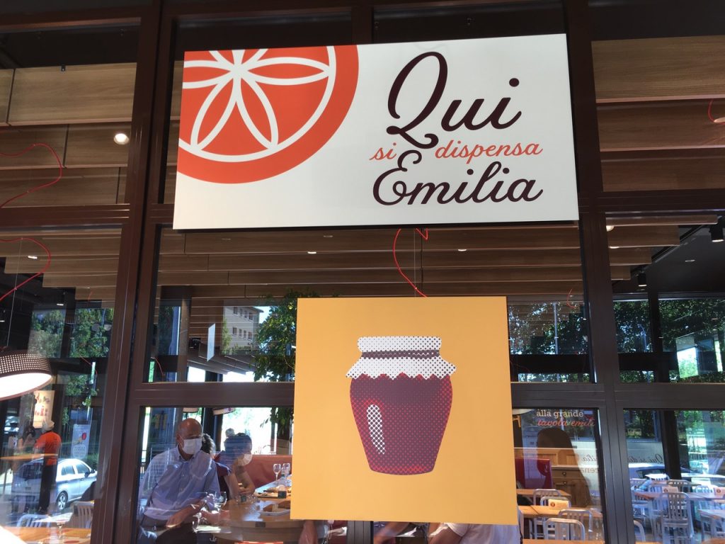 QUI si dispensa EMILIA” questo è uno degli slogan, molto efficace, che fa bella mostra di sé nel nuovo locale bolognese e che sintetizza la mission di questa società di ristorazione nata a Modena nel 2004 per una geniale intuizione di Alfiero Fucelli.