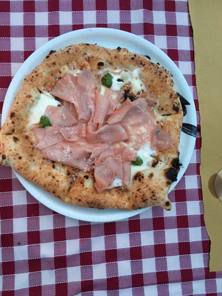 Infine non poteva mancare la Pizza dello Chef. L’estro di Vincenzo ha abbinato mozzarella fior di latte, cipolle stufate, guanciale, pepe e pecorino romano in un mix piacevolmente saporito.