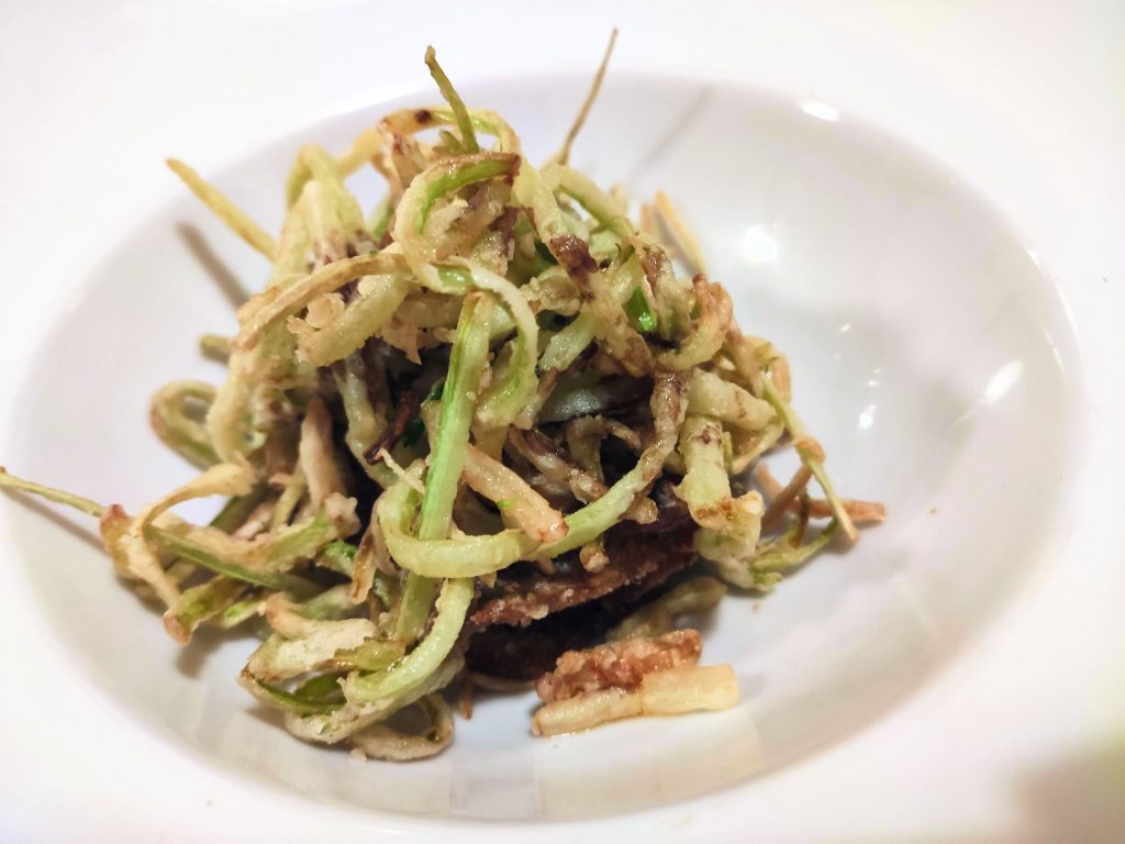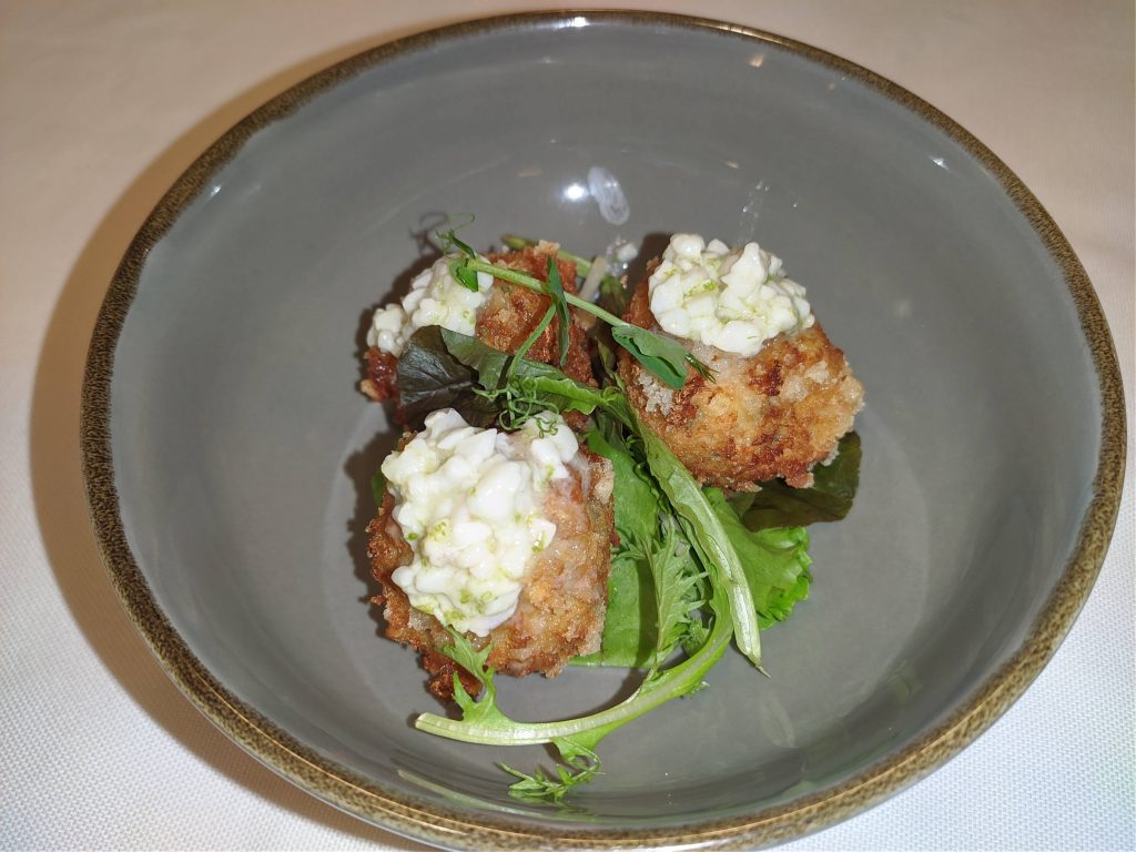 Siamo stati accolti da una sorridente Francesca Romana nella sala più ampia, con una bella bollicina e uno sfizioso benvenuto a base di buccia di patate fritta e maionese al lime (in carta a 5 euro). Nel calice la sommelier ci ha fatto trovare un graditissimo Trento Extra Brut DOC “Cuvée N°4” 2015 – Etyssa: fresco, sapido, ben bilanciato in acidità, un vino che con i suoi profumi fruttati e di fiori bianchi, è l’ideale per accompagnare l’aperitivo. In tavola, un delizioso pane fresco (home made) da lievito madre.