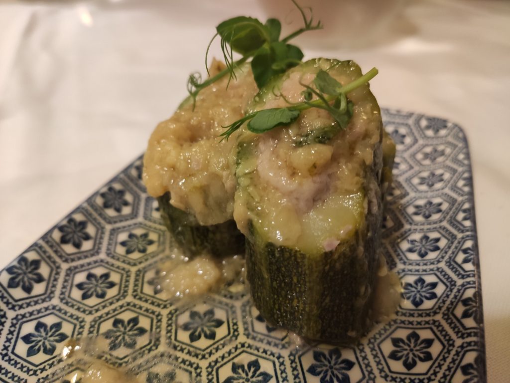 Ci accomodiamo e iniziamo con una carrellata di antipasti: ottimi i classici fiori di zucca fritti, asciutti, croccanti e dal ripieno ricco e goloso, seguono le più originali Polpettine di Melanzane affumicate con calamaro marinato al Lime, che ci conquistano col guscio croccante e il cuore fondente di melanzana e provola affumicata. Il loro gusto dolcemente fumé si sposa perfettamente con il calamaro tagliato a julienne sulla cima, appena rinfrescato da una grattata di lime. Da provare. Assaggiamo anche le zucchine, ripiene di carne gustose e saporite, ma c’è anche la Trippa alla romana, col sugo, la menta e il pecorino, molto apprezzata dai commensali.