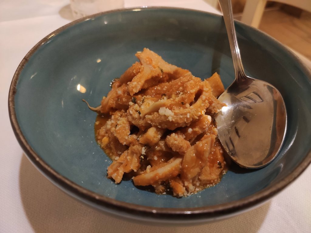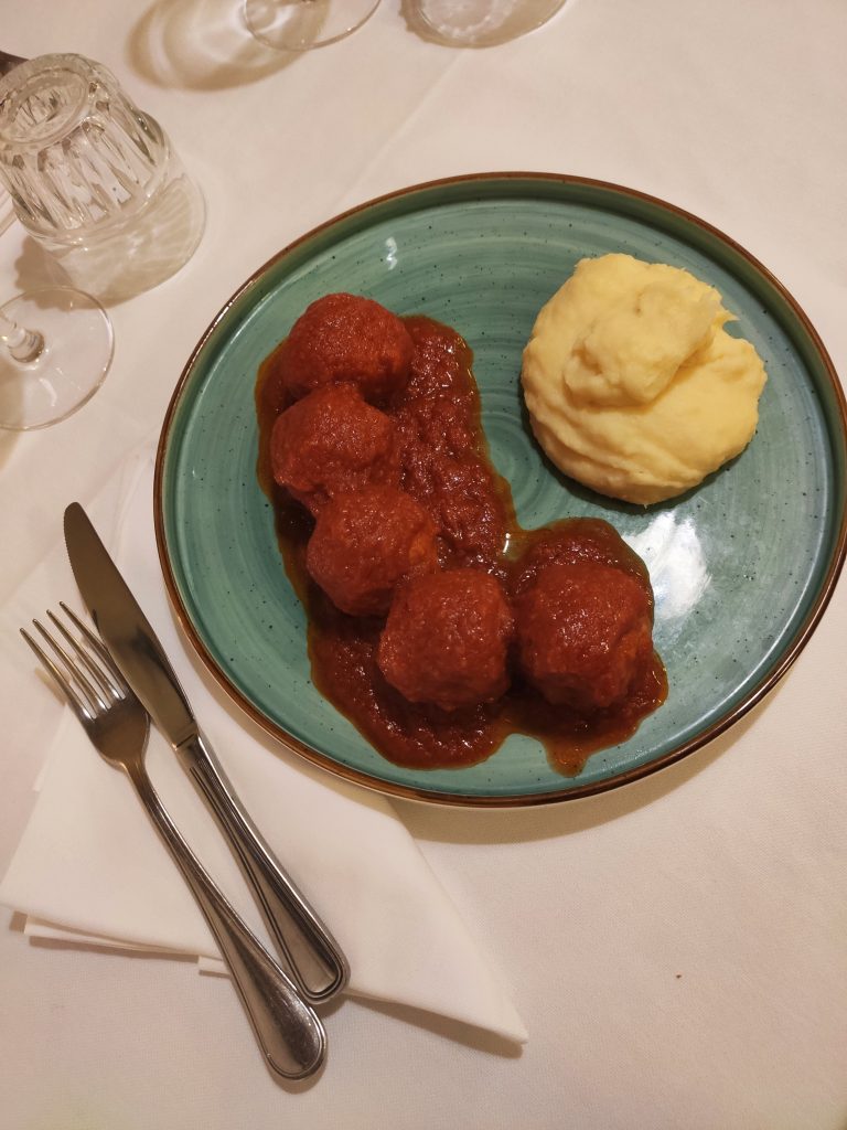 Buone anche se lievemente sapide le Polpette al Sugo della Mamma, vero comfort food della domenica, morbidissime a base di carne di vitella. Annaffiamo i secondi con un egregio Bolgheri Rosso ‘Villa Donoratico’ Tenuta Argentiera 2017, un rosso complesso e intenso, dai sentori di frutti bosco, spezie e note di cacao e caffè. Setoso e raffinato, morbido, fresco e di buona persistenza, è un abbinamento che esalta queste carni.