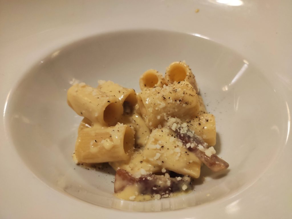 Al momento del primo ci viene servita una Cacio e Pepe squisita, eseguita perfettamente, e molto delicata al palato: la pasta cotta a regola d’arte, era avvolta in una cremina di formaggio setosa e vellutata, ben punteggiata dalla gradevole speziatura del pepe fresco macinato. Proviamo anche la Carbonara, preparata mantecando direttamente sul fuoco l’uovo, insieme ad abbondante pecorino e parmigiano, per ottenere una simil crema inglese, un’emulsione che lega molto efficacemente la pasta, mentre sotto ai denti la gradevole la consistenza del guanciale tagliato sottile, offre una piacevole croccantezza. La mezza manica al dente è in effetti ben nappata dalla cremina così ottenuta, tuttavia il gusto della carbonara, nella sua piacevolezza, ci sembra connotato da uno stile in cui si dà risalto soprattutto al formaggio, a discapito del sapore vero delle uova, che risulta più sfumato.