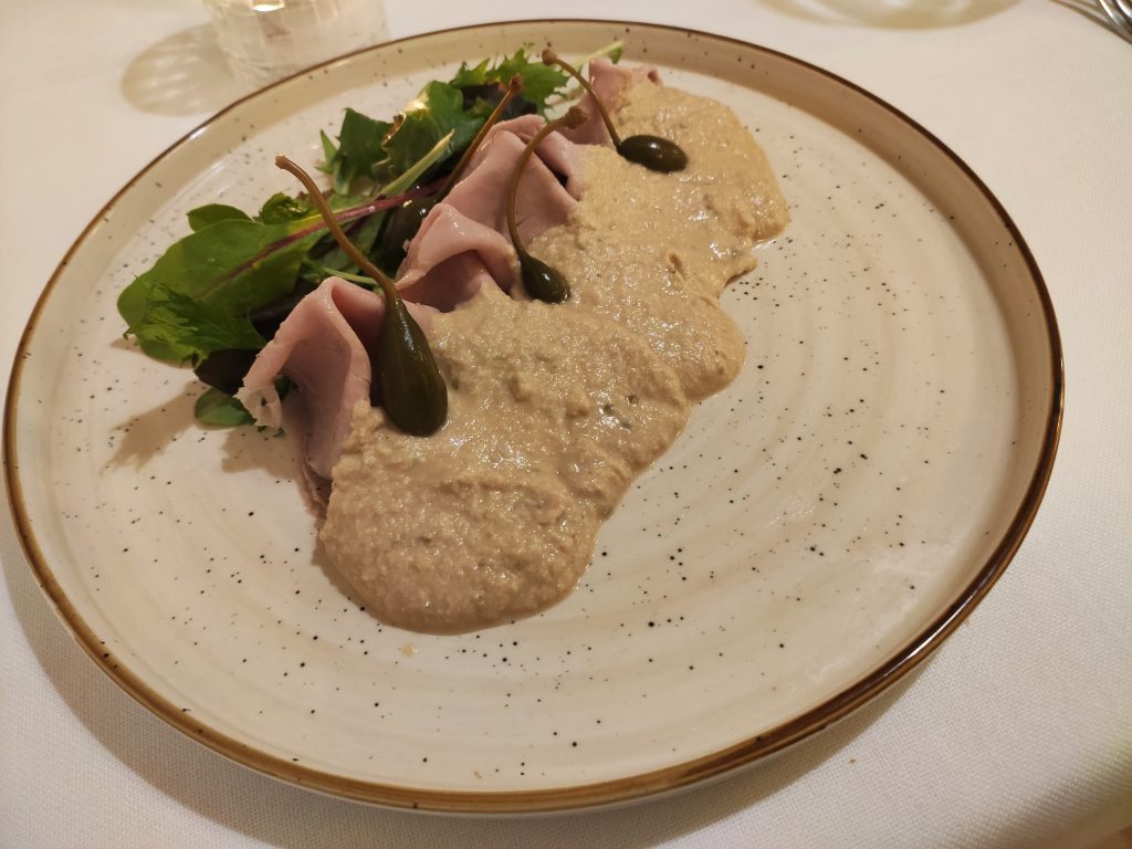 Arrivano in tavola i secondi, tra cui prediligiamo: il Vitello tonnato con la salsa ruvida, profumata di capperi, sulla carne tenera e succosa, e il Maialino con le patate arrosto, questo, a mio avviso, tra i migliori piatti della serata. Il maialino infatti si scioglie in bocca, la sua carne profumata solo con aglio e rosmarino, viene cotta a bassa temperatura per una notte e così resta tenerissima ed umida, successivamente il maiale viene fatto rosolare dalla parte della pelle per ottenere quell’irrinunciabile crosticina croccante, che lo rende una vera goduria.