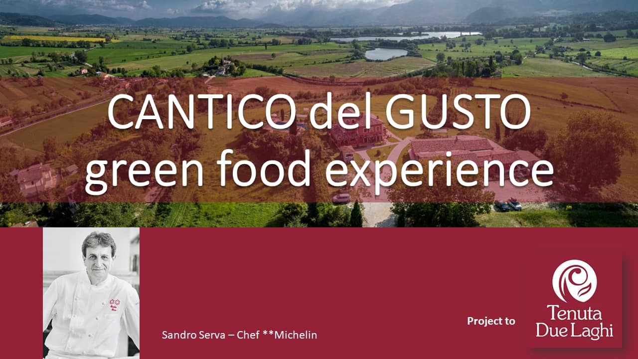 Le ricette tematiche che lo chef Sandro Serva realizzerà saranno dedicate agli scritti di San Francesco. Quattro le tematiche: l’acqua dolce, la terra, il sole, la luna. questo perchè Tenuta Due Laghi è ubicata proprio nel mezzo del cammino di San Francesco, è una tappa intermedia dalla quale si possono ammirare tutti i santuari. Da qui il nome “Cantico del Gusto”.