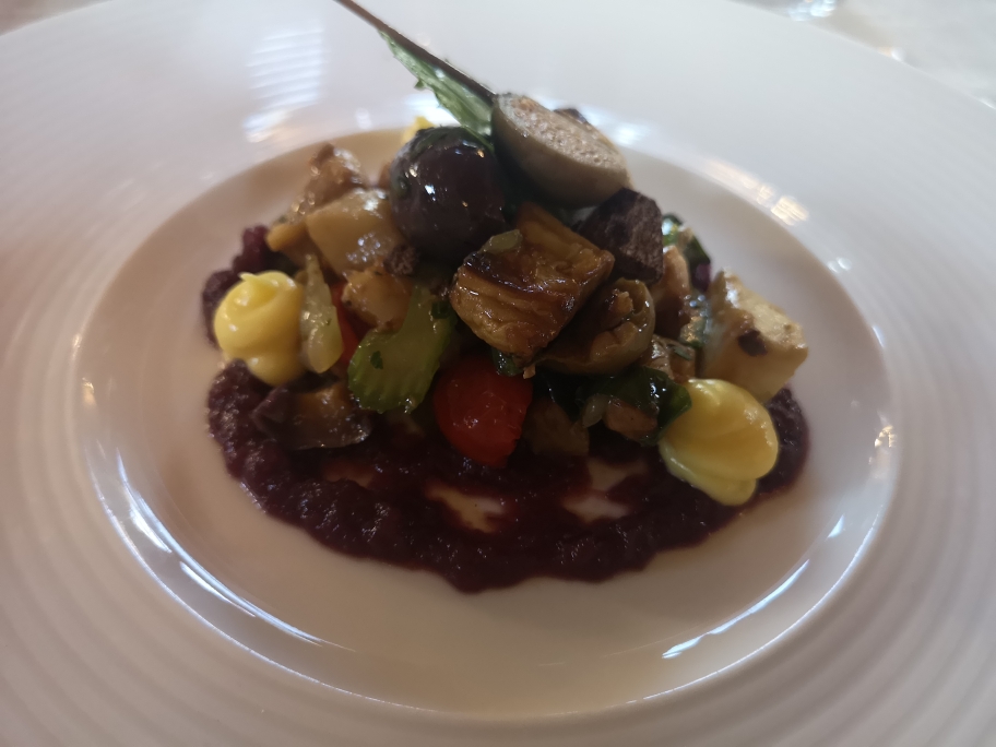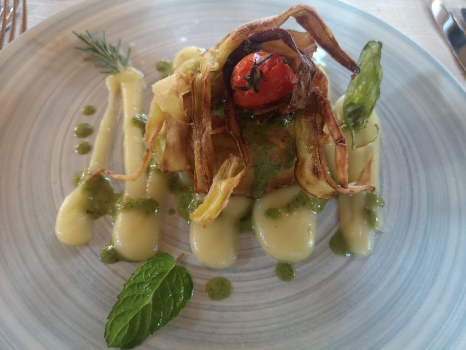 A seguire il polpo fritto su crema di patate rosse cipollotto e maionese al limone, sostituito nella versione veg da un tortino di broccolo sul medesimo condimento che ne ha potenziato il gusto in una perfetta armonia di sapori.