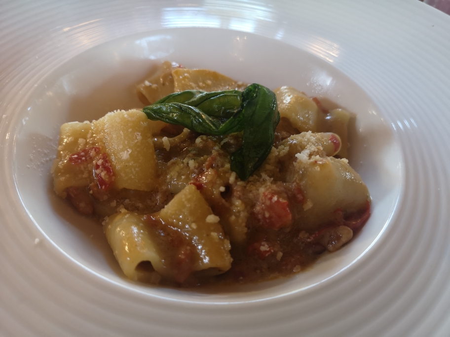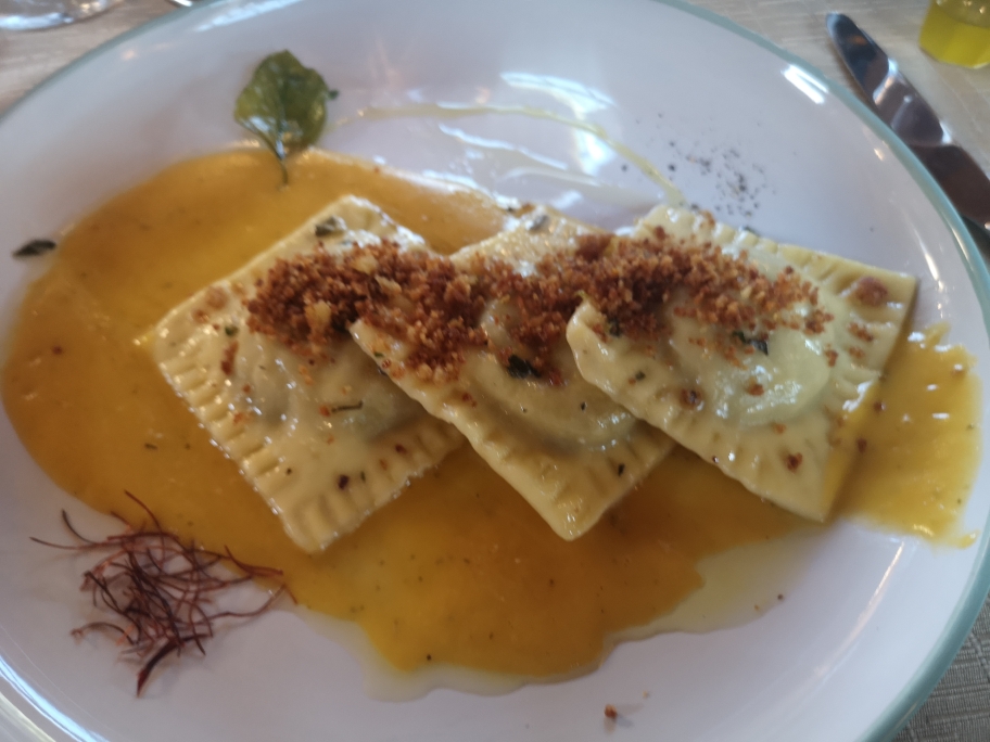 Sovrano indiscusso del pranzo il raviolo con fungo porcino su vellutata di zucca gialla, ribattezzato l’autunno nel piatto per la perfetta espessione dei sapori che ci si aspetta da un piatto di stagione.