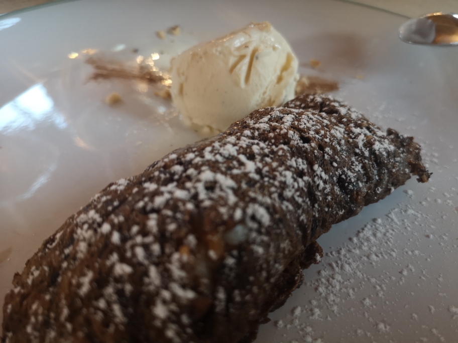 Chiude il percorso l’ova murina, un piatto tipico saccense, di origine monacale, in cui la cialda di cannolo è sostituita da una “frittatina di mandorle e cioccolato” riempita da biancomangiare ovvero crema di latte alla cannella. A rinfrescare il morso “caldo” una quenelle di gelato alla vaniglia che lo ha impreziosito in un piacevole gioco di rimandi.