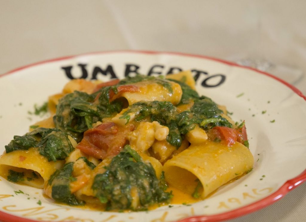 A Chiaia, Umberto 1916 vi verrà proposta una cena a base di pesce con Paccheri di Gragnano alla Masaniello (con seppie, gamberi, pomodorini e friarielli), risotto alla pescatora e orata per secondo.