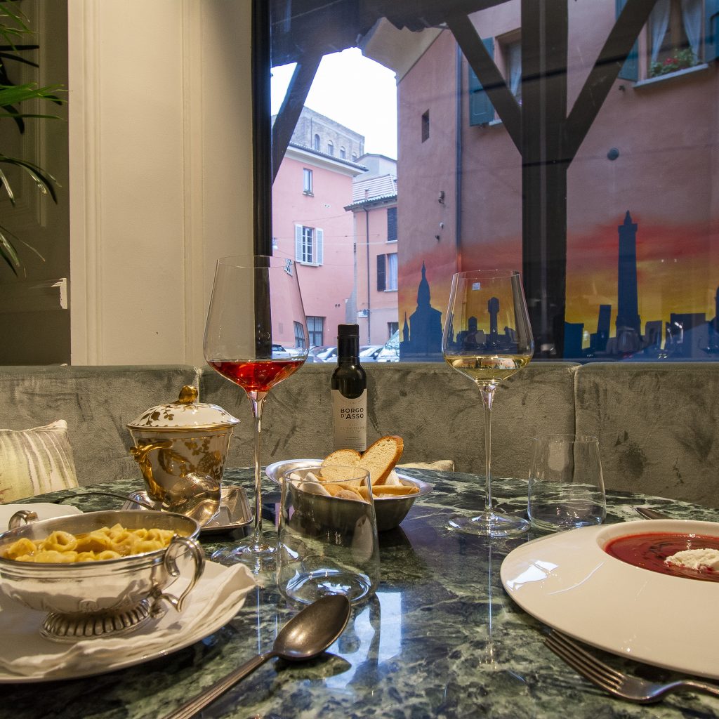 Il nostro percorso parte dal centro in via San Nicolò 2 C, vicino alle due torri. Casa Azzoguidi punta sui piatti di pesce cominciando dall’antipasto I Tre mari (in un piatto), Salmone tataki con sesamo bianco e nero, Mazzancolle marinate agrodolci, Mini burgher aperto di orata con pan brioches e maionese al nero di seppia, Lingotto di carote e zenzero con carpaccio di verdure, Disco di semolino, seppia e piselli e corallo di crostacei, Risotto all’astice, Coda di rospo vestita di bacon su purea di broccoli, salsa di arancia mango, il Sorbetto ciliege e Lambrusco separa da un’immancabile Medaglioni di cotechino con lenticchie.