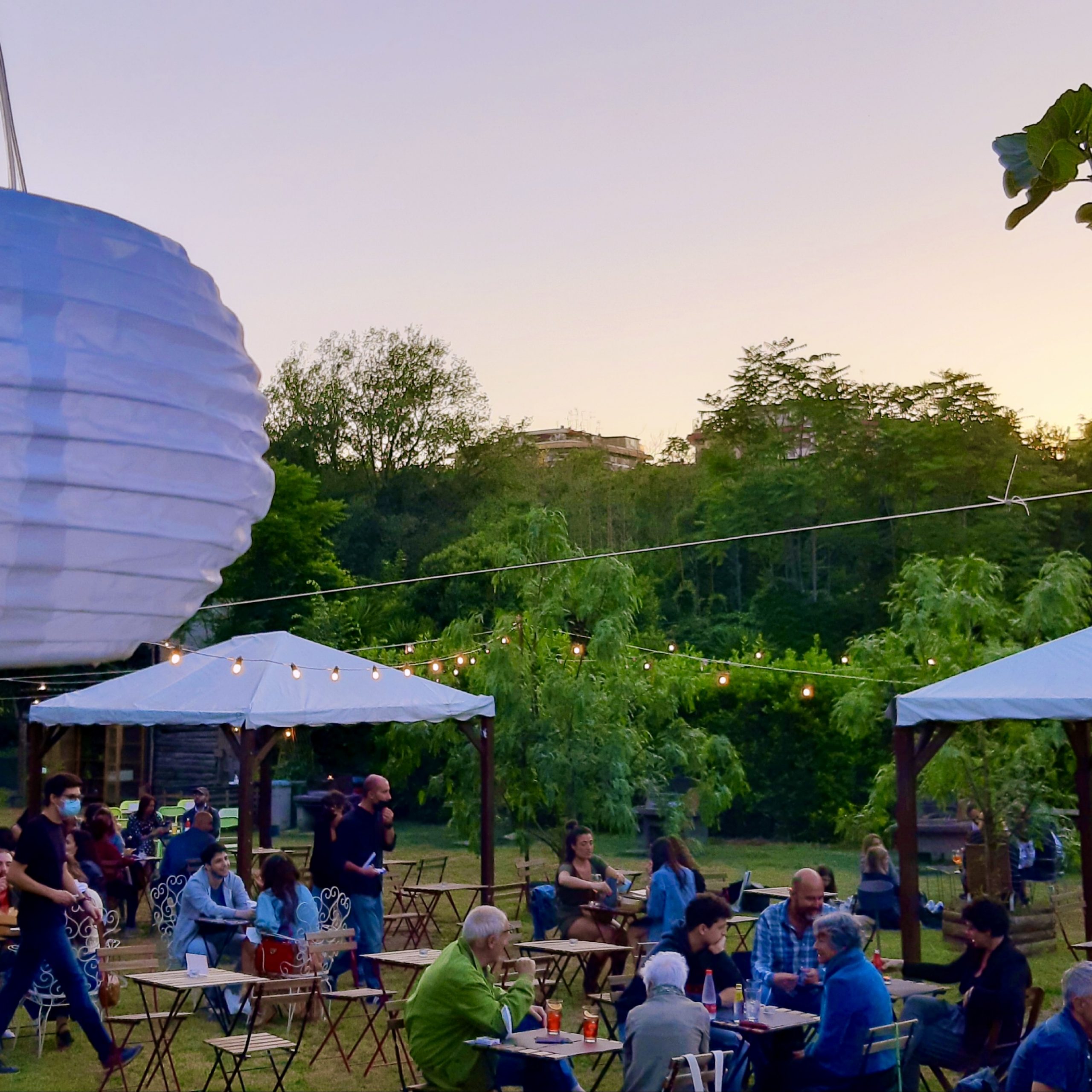 Atmosfera di giardino segreto in festa per Mister Doyle, con le file di lampadine che uniscono gli alberi, i tavoli e le sedie di legno, il gazebo, i giochi per bambini, e specialità smoked bbq in modalità street food.