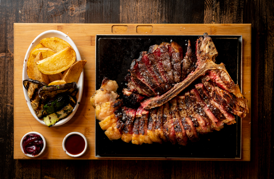 Punta sulla selezione di manzi e tagli pregiati toscani, posti in bella vista nel grande banco frigo subito all’ingresso, su una mise en place essenziale e di gusto, sui quadri eccentrici dell’eclettico artista e designer romano Gian Luca Gentili dedicati al nuovo brand, sull’ampia e colorata scelta di piatti, alcuni attinti alla cucina tipica del tacco d’Italia, sua terra d’origine, altri ispirati da da matrici multietniche rilette in chiave mediterranea.