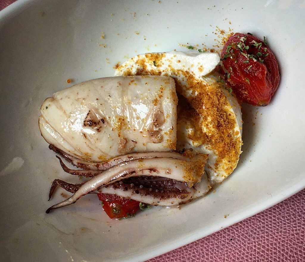 La sua proposta per il menù vede un giusto mix tra pesce e carne cominciando dagli antipasti tra cui Specchio d’abisso (battuto di gamberi e mazzancolle con chips di riso soffiato al nero di seppia), Inganno (tartare di manzo con ricotta montata e polvere di capperi), Non chiamatelo vitello tonnato (spalla di vitello, con maionese alla bottarga di muggine), Ricordo di un bollito (dadi di lingua di manzo con giardiniera artigianale), e Scottato (calamaro scottato con burratina e pomodori confit).