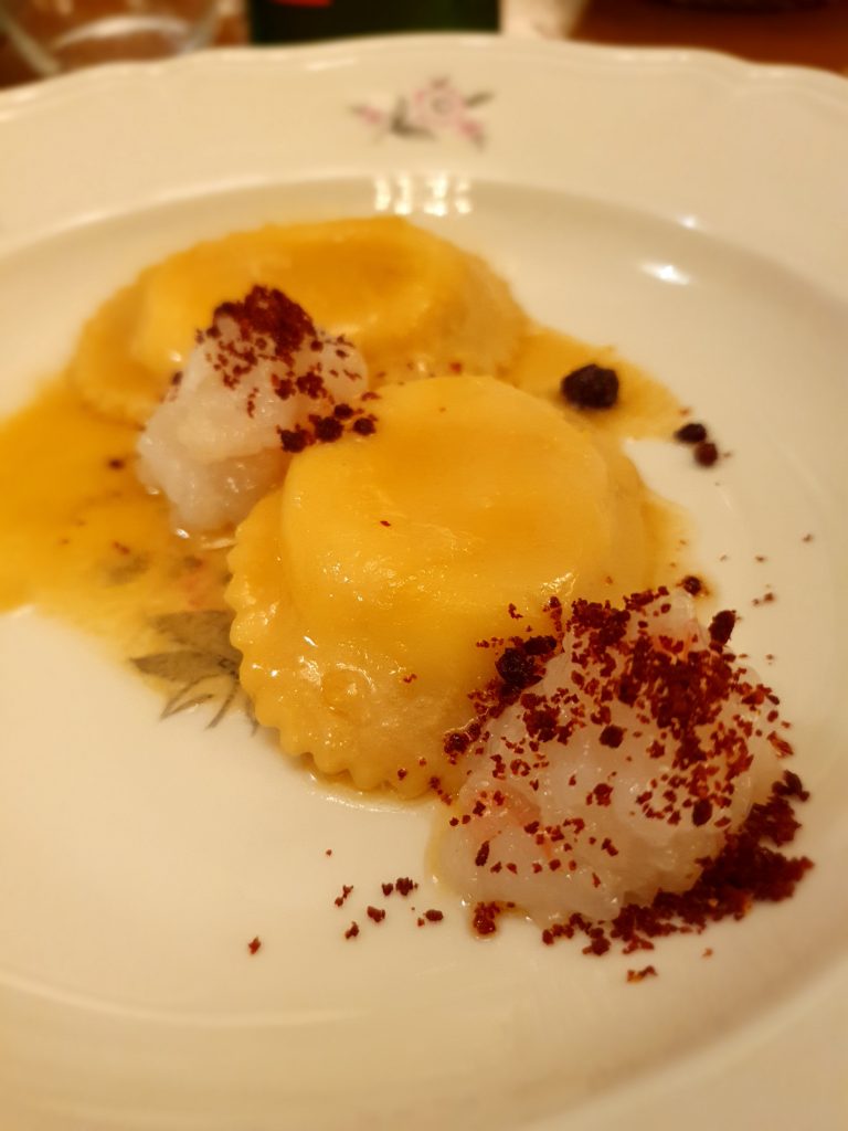 Tra i fuori menu diventati ormai un must di Casa Cantagallo ci sono poi i Tortelli di bufala con battuto di gamberi e polvere di peperone crusco. La sfoglia, spessa e porosa, fa da contraltare alla cremosità del ripieno creando una bella sinergia.