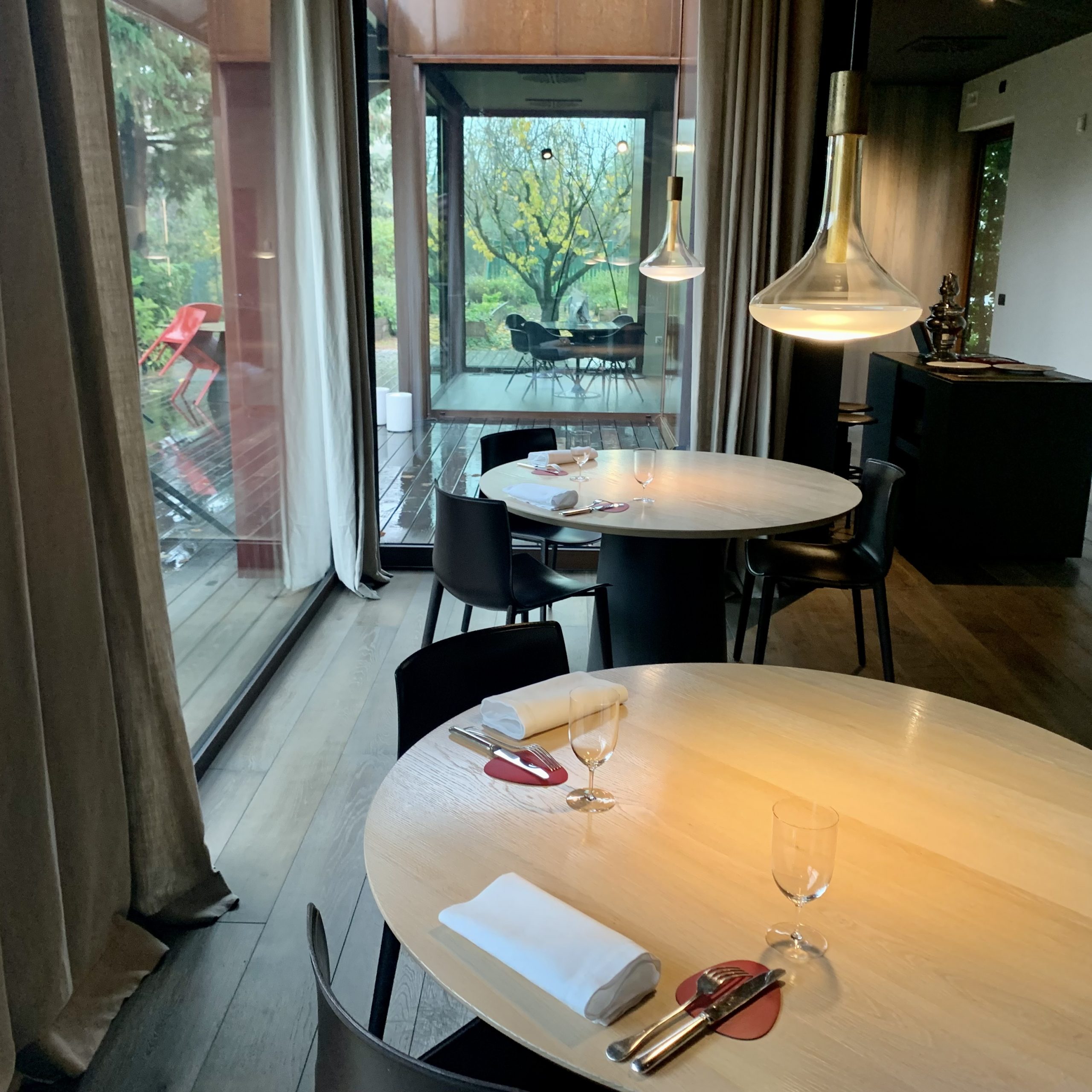 La tavola è un affare di famiglia poiché nella “private room” c’è un unico tavolo tondo che nella base ha una struttura firmata dell’interior designer Cattelan. Il piano invece in marmo proviene dalla casa di famiglia. Si tratta di un marmo verde, di rara bellezza, detto anche serpentino a forma sferica con capacità di sedere 4 commensali.