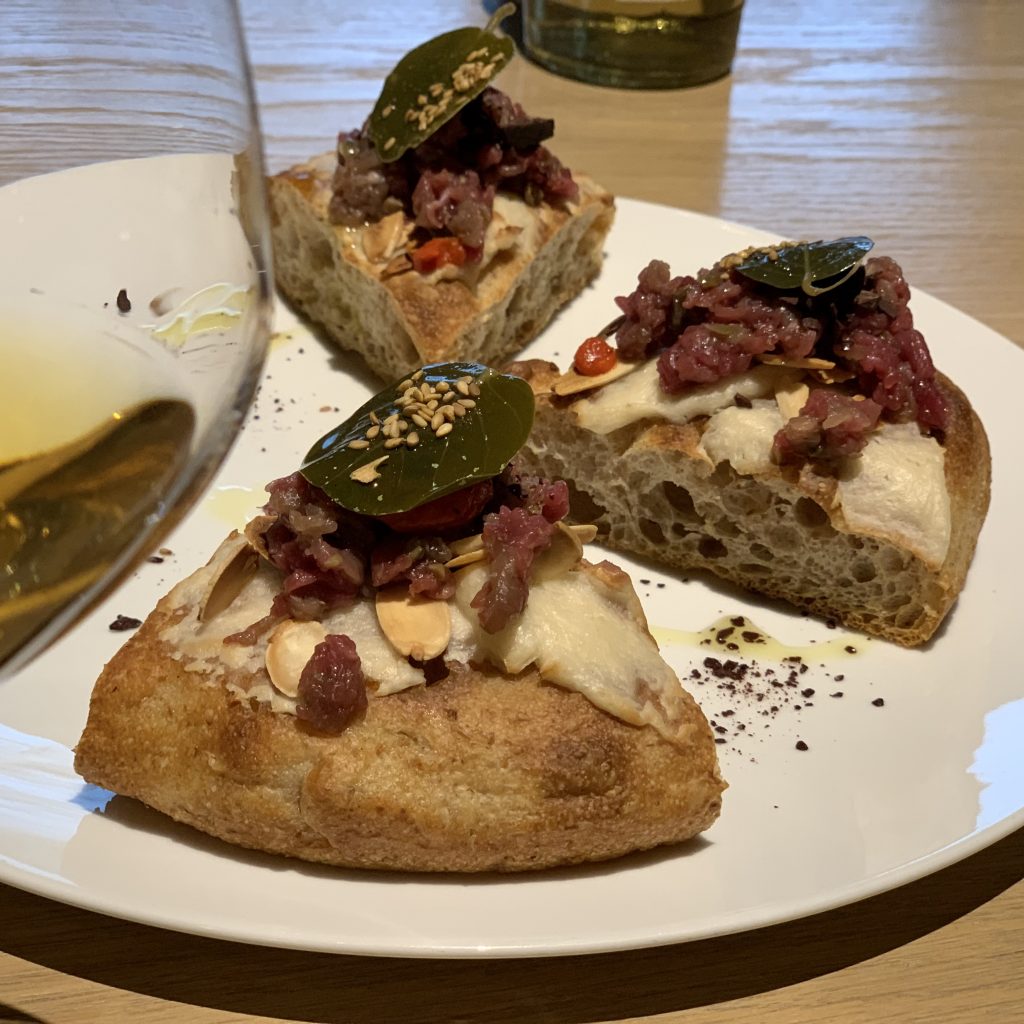 -Asino battuto al coltello,crema di mandorla capperi e cioccolato al 70%