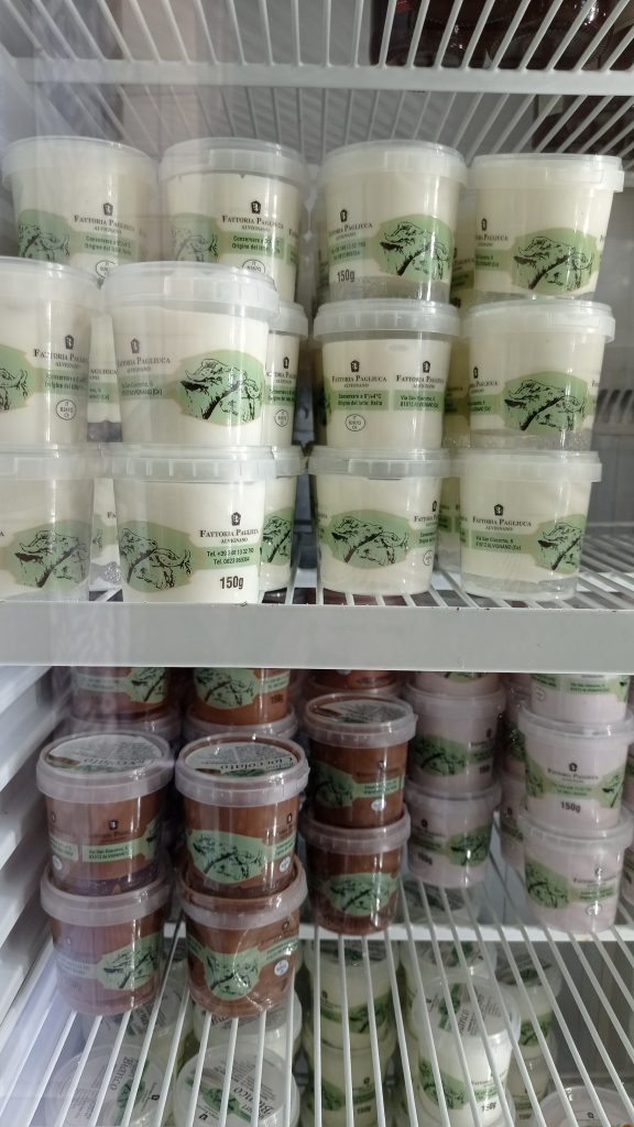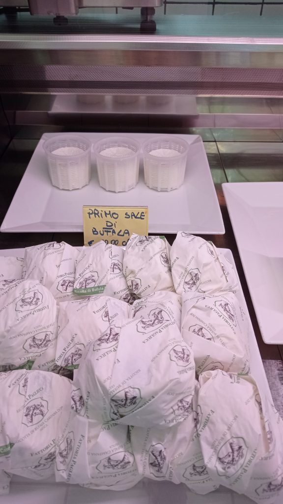 Tutto ci appare incontaminato, una storia di famiglia che ha saputo modernizzarsi per restare fedele a sé stessa. Un’azienda, va detto, che lavora a “impatto zero”, utilizzando solo energia verde rinnovabile. Oggi al timone ci sono i coniugi Irene e Federico, il latte di bufala viene prodotto esclusivamente in azienda ed è un latte di alta qualità. Bufale alimentate con foraggi selezionati, coltivati sugli stessi terreni aziendali. Tanto verde intorno a noi, latte altamente proteico, lavorato a crudo ed in maniera artigianale: mozzarella, ricotta, primo sale, il famoso stracchino, variazioni di yogurt e panna cotta. Assaggiamo i prodotti e ammiriamo loro, le vere protagoniste. Quattrocento bufale in perfetta salute, visibilmente felici.