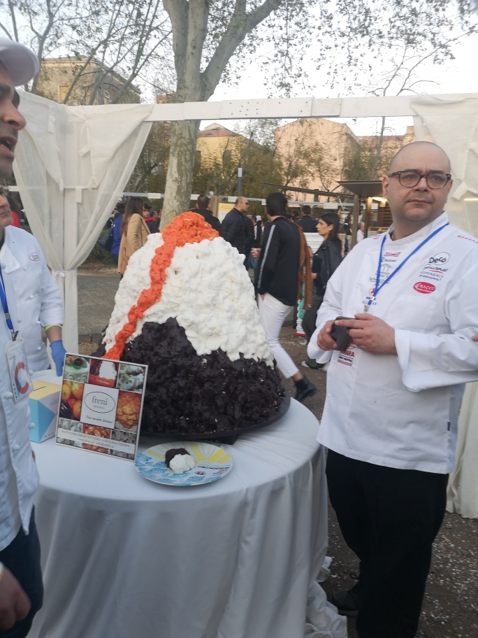 Sempre in omaggio all’Etna la montagna di pignolata preparata dal pasticcere messinese Lillo Freni che, oltre ai classici gusti cioccolato e glassa al limone ha creato una interessante variante all’arancia.