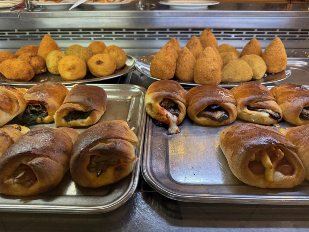 E non manca, negli scaffali dei banconi, la gamma di proposte della tavola calda, con i primi piatti, innanzitutto. Come la pasta al forno catanese con le polpette, la mozzarella e l’uovo, i cannelloni e la lasagna. Si fanno spazio, poi, ça va sans dire, gli arancini in sei varianti, anch’essi sfornati dal laboratorio di gastronomia interno: <<Al sugo di carne, con le melanzane e con il pistacchio non sono da perdere. Ma vale la pena provare anche le cartocciate farcite e la cipollina catanese>>, aggiunge il garbato signore che cura la regia del famoso “Prestipino”.