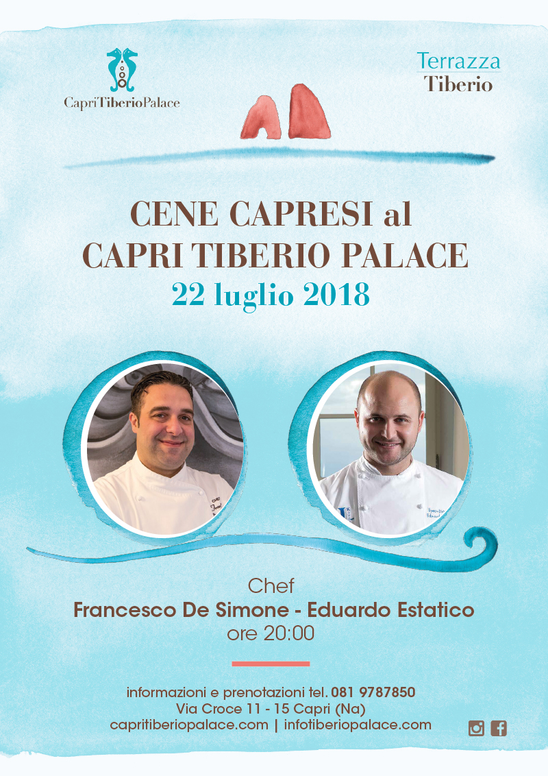 Il 22 luglio il ristorante aprirà la stagione estiva con un grande evento: una cena a quattro mani tra De Simone e Eduardo Estatico, chef dell’hotel JK Place. La serata, dal titolo Cene Capresi, avrà un menu davvero vario. Si partirà con il coulis di melone cantalupo, totanetto, caprino e maggiorana, la patata croccante con live nere, scuncigli e olio al peperoncino di De Simone e con l’indivia belga con burro alici e il babà caprese di Estatico.