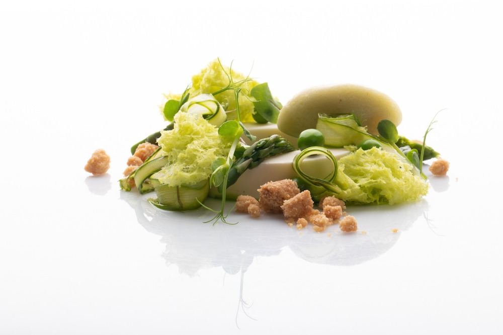 Pelare gli asparagi e tagliarli per la lunghezza con il pelapatate e metterli sottovuoto con un po di sciroppo e vaniglia per 1 notte. Sgranare i piselli freschi e sbianchirli in acqua e sale per 1 minuto. Scolare e freddare. I baccelli lavarli accuratamente e centrifugarli. Filtrare il liquido e dolcificarlo con un po di sciroppo.