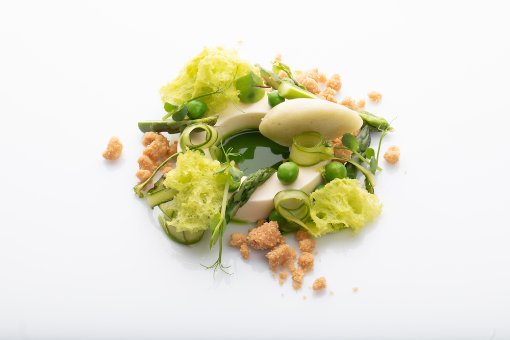 Pelare gli asparagi e tagliarli per la lunghezza con il pelapatate e metterli sottovuoto con un po di sciroppo e vaniglia per 1 notte. Sgranare i piselli freschi e sbianchirli in acqua e sale per 1 minuto. Scolare e freddare. I baccelli lavarli accuratamente e centrifugarli. Filtrare il liquido e dolcificarlo con un po di sciroppo.