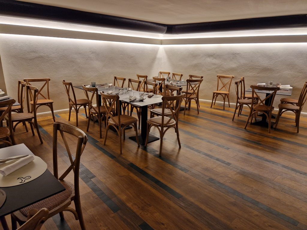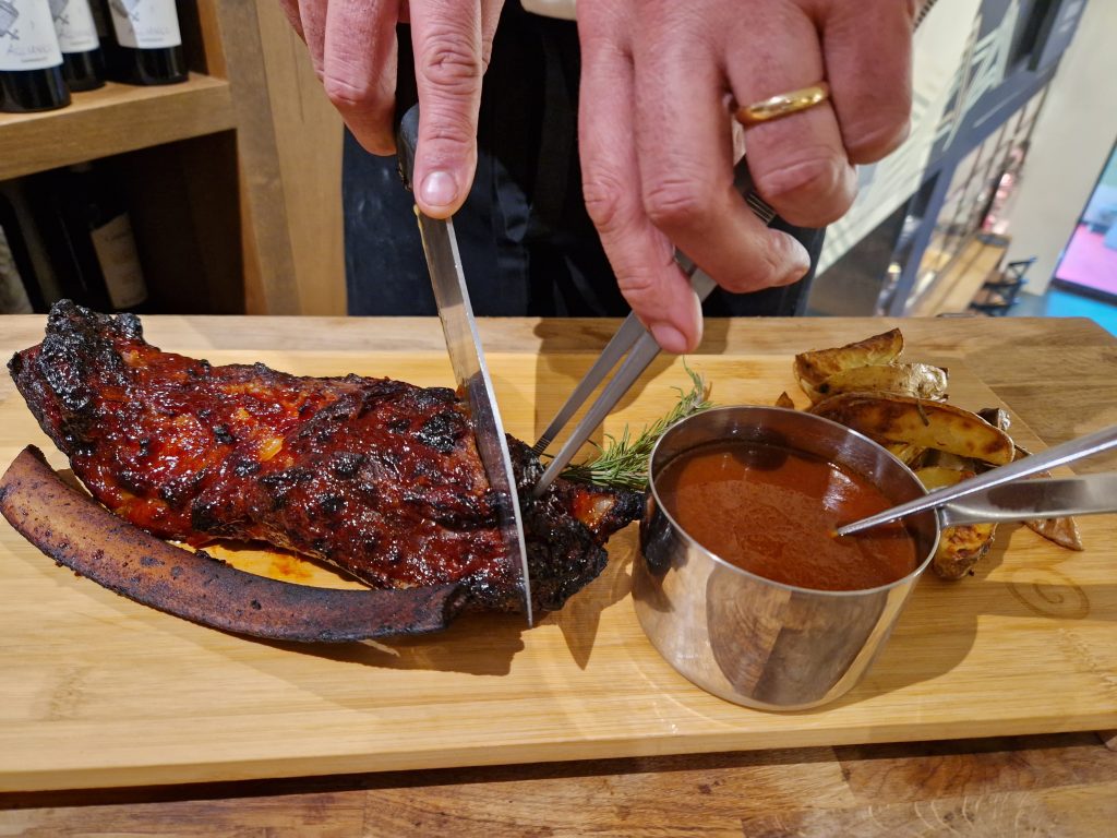 Apre le danze il Tartare Bar. Proposta agile e densa di qualità, da godere al bancone con vino, birra oppure cocktail. Per l’aperitivo e non solo. Tartare e carpacci deliziosi anche la naturale, ma nulla vieta di spaziare. Incontriamo Cristian Nappa, sommelier, mixologist e grande esperto di birra. È lui che dirige il settore beverage del gruppo Le due torri. Ed è lui ad introdurci Giuseppe Auricchio, executive chef dell’intero progetto. Un tutt’uno con il suo “giochino” prediletto, la Parrilla madrilena: in pratica, una parete di griglia, affumicatore, vani per basse temperature e cenere per la brace, il fuoco con le sue molteplici possibilità di cottura.