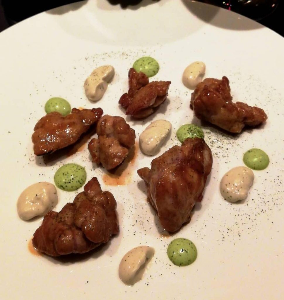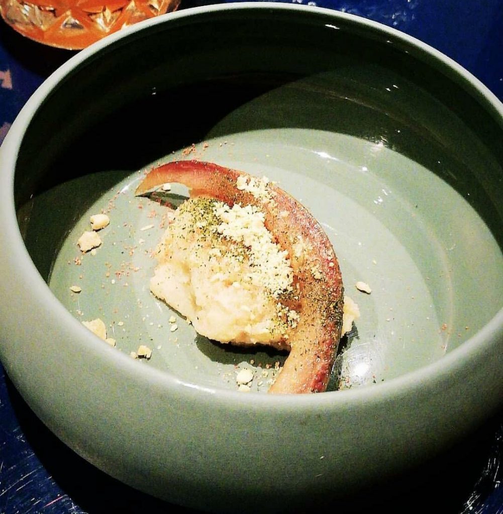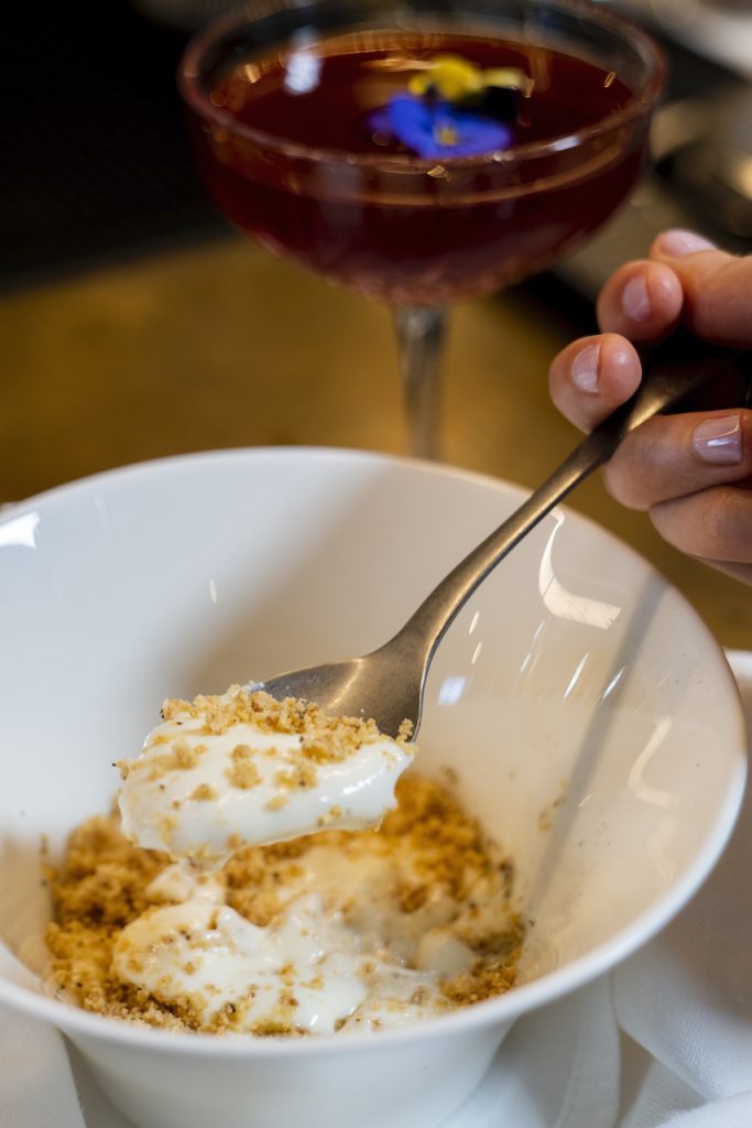 Le danze si aprono con un cocktail di benvenuto. La scelta è ben definita e i sapori selezionati mi accompagneranno nell’immersione culinaria. Scelgo lo Spritz-en: a base di Spritz e sorbetto allo zenzero. Si presenta come una bevanda golosa, un frullato dai calori pastello e con un ciuffo di finta panna montata in cima: delizioso, leggero, amabile.