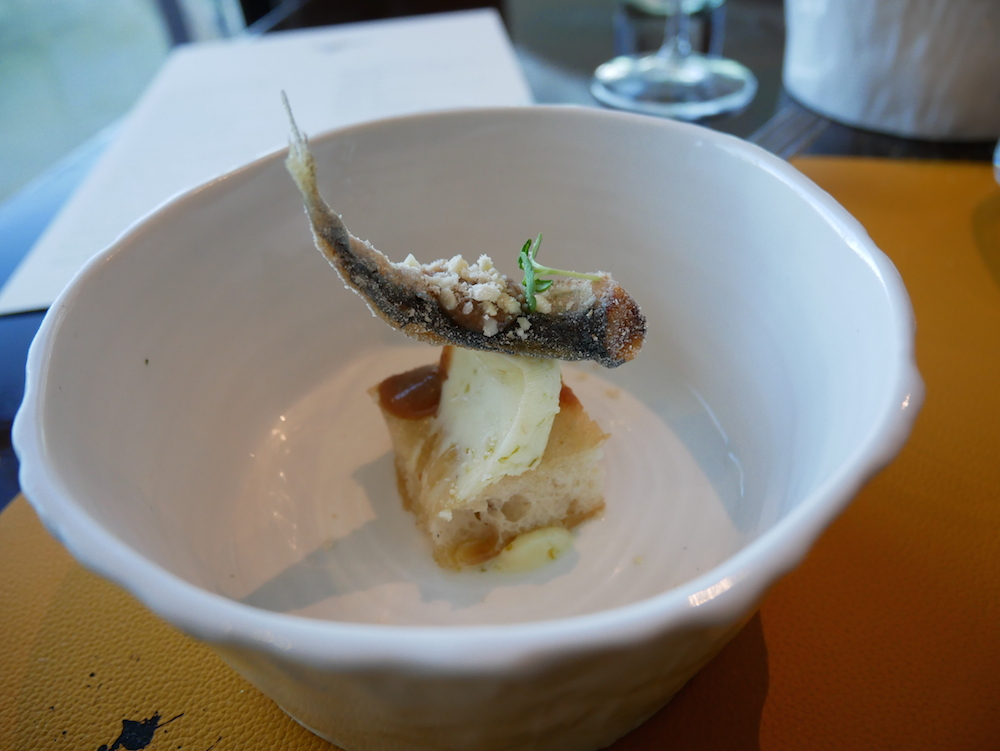 Assaggiamo prima lo sfizioso “Stoccafisso di Sarde” (16 euro): una sarda trattata come uno stoccafisso e fritta, accompagnata con ristretto di uva sultanina, burro aromatizzato al lime e mandorle, adagiata su un cubo di focaccia croccante. Un piatto che rivisita con successo la “sarda in saor” veneta.